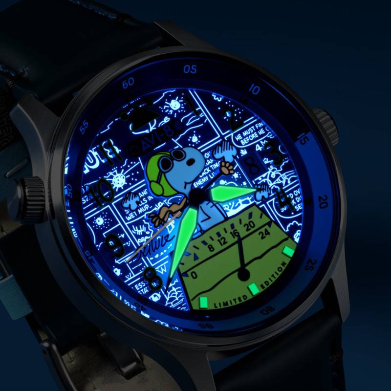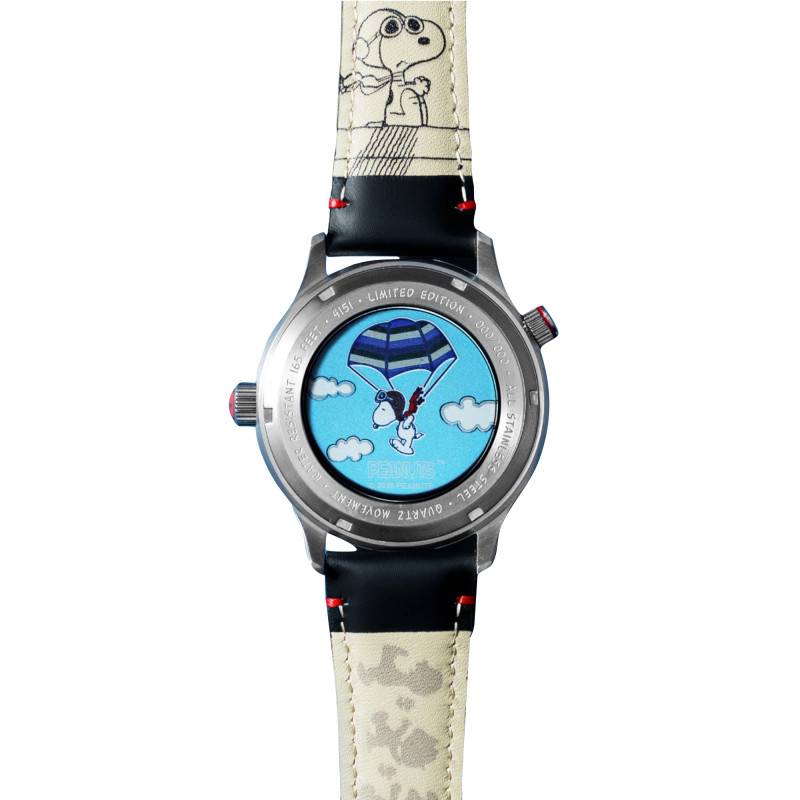 Le cadran de la montre est sublimé par sa finition peinte représentant Snoopy, le chien rêveur avec son casque d'aviateur au centre de l'action. Les chiffres arabes noirs se détachent nettement sur le fond blanc, garantissant une lisibilité parfaite. Les aiguilles luminescentes affichent les heures, minutes et secondes avec précision associée à un compteur 24h. Le tout est protégé par un verre minéral traité antireflets, une caractéristique qui complète cette composition.