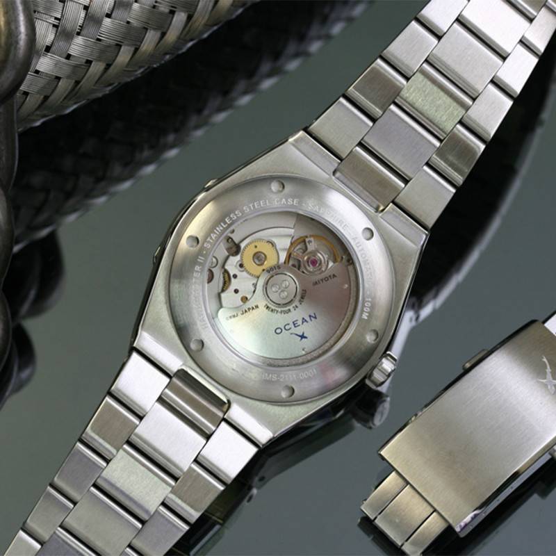 Au cœur de cette montre réside le puissant mouvement Miyota 9015, un calibre japonais qui jouit d'une réputation pour sa fiabilité et sa précision. Fonctionnant à une fréquence de 28.800 A/h (4 Hz), ce mécanisme automatique assure non seulement un fonctionnement souple mais aussi une réserve de marche robuste de 42 heures. La présence d'une masse oscillante siglée OceanX, visible grâce au fond transparent, témoigne de l'attention portée aux détails. Les fonctions horlogères du Miyota 9015 incluent l'affichage de l'heure, des minutes, des secondes et de la date, rendant cette montre à la fois pratique et sophistiquée, un incontournable pour tout amateur de montres.