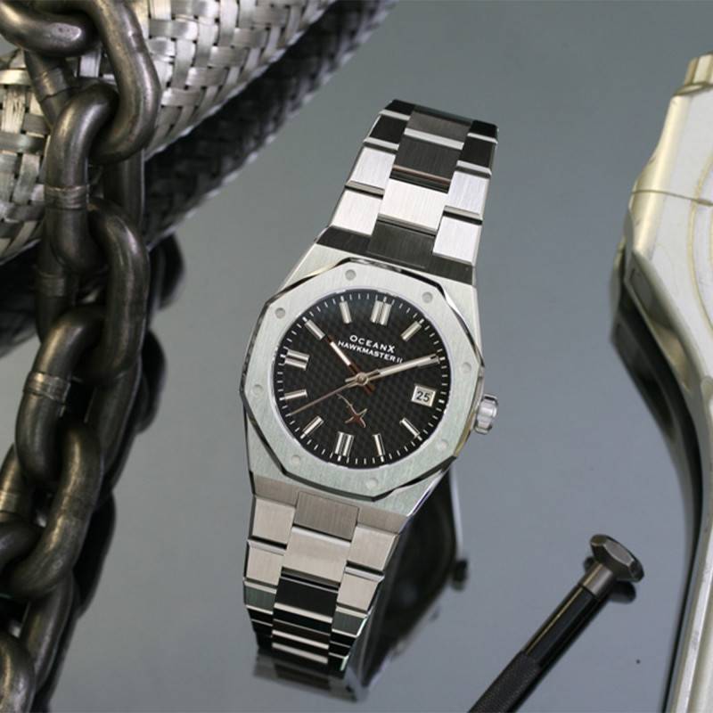 Le bracelet accompagne avec grâce le design soigné de la montre, fabriquée également en acier inoxydable, offrant une continuité visuelle et matérielle séduisante. Sa couleur grise et son alternance de finitions brossée et polie soulignent le luxe subtil de ce modèle. La largeur du bracelet garantit un ajustement optimal au poignet, tandis que la boucle déployante ajoute une touche de sécurité et de commodité. Ce bracelet donne à la montre une allure de sophistication simple mais évidente, renforçant le caractère exceptionnel de la Hawkmaster II Black.