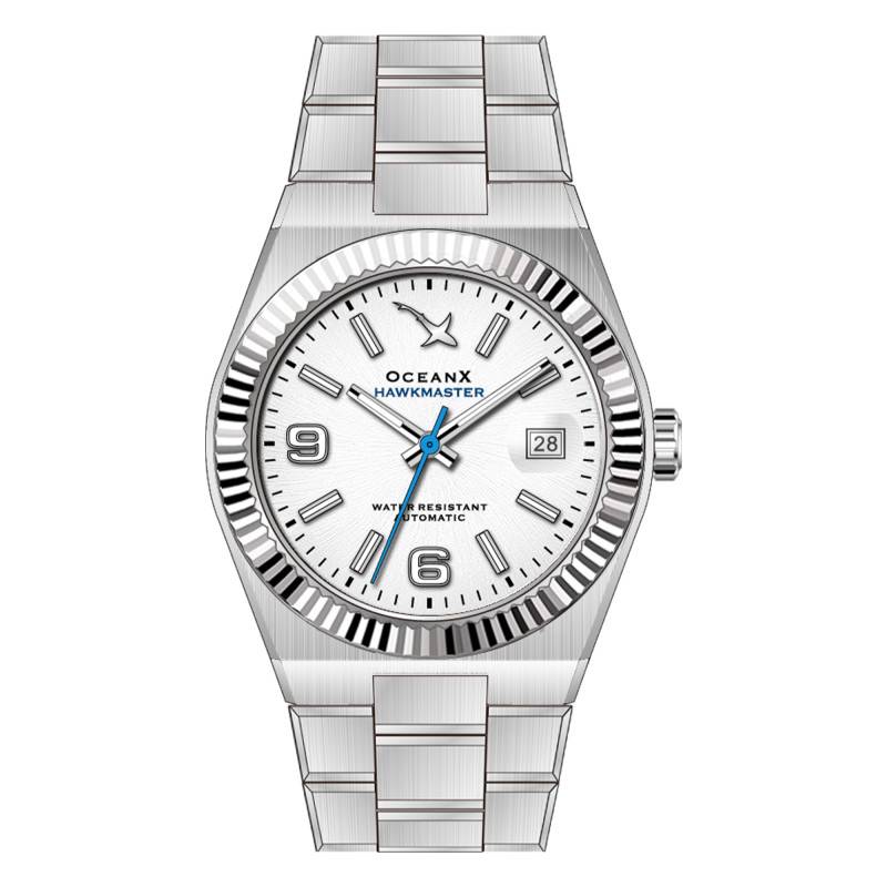 La montre OceanX Hawkmaster White HMS111 est un symbole de sophistication et de robustesse, conçu spécifiquement pour ceux qui apprécient l'art de l'horlogerie. Son boîtier tonneau en acier inoxydable garantit une durabilité exceptionnelle, tout en offrant une allure raffinée grâce à sa finition mate brossée/satinée. Avec un diamètre de 39,00 mm et une épaisseur de 10,80 mm, cette montre s'adapte parfaitement au poignet, offrant un port confortable pour un usage quotidien ou pour des occasions spéciales. La lunette à effet cannelé ajoute une touche de modernité à son design classique. La montre est protégée par un verre saphir, connu pour sa résistance aux rayures et son traitement antireflets, garantissant une lisibilité claire en toute situation.