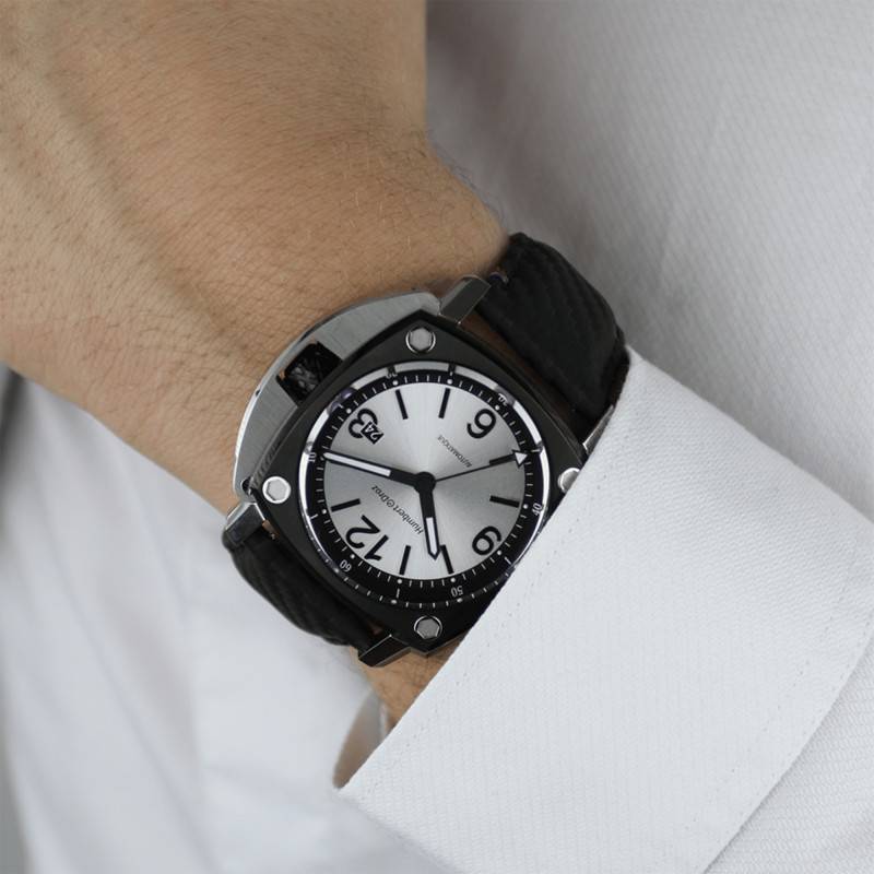 Humbert-Droz se démarque par son savoir-faire familial acquis dans la pure tradition horlogère. La marque propose des garde-temps de qualité avec des designs élégants et intemporels réalisés avec passion. Elle exprime à travers la HD11 une déclaration audacieuse à l'héritage républicain français. Cette collection est représentée ici par la montre HD11 "Nivôse" qui tire son nom de "la neige qui blanchit la terre de décembre en janvier". Élégante et assez particulière, celle-ci se pare d'un joli boîtier coussin conçu en acier inoxydable 316L. La carrure polie et argentée est complétée par une lunette traitée au PVD noir et rehaussée par un brossage radial. Maintenue par des vis, celle-ci entoure le verre saphir qui protège le cadran des rayures. L'ensemble du boîtier affiche un diamètre de 44 mm et une épaisseur de 13,50 mm qui sont des dimensions bien adaptées aux poignets masculins. Sur le côté droit de la montre se trouve la couronne vissée protégée. Texturée et de couleur noire carbone, elle assure le réglage des aiguilles et de la date. Pour ce qui est du fond de boîte, il présente une fenêtre transparente qui vous permettra d'admirer les composants du mouvement. Ce fond promet une étanchéité de 10 ATM.