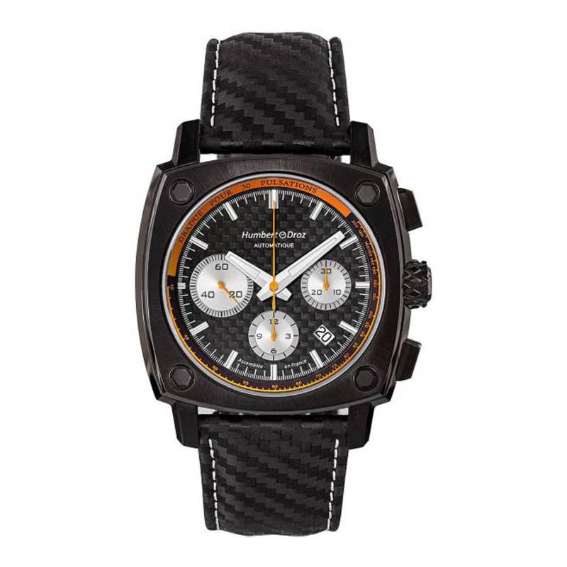 Fondée en 1956, Humbert-Droz a facilement pu s'implanter sur le marché de l'horlogerie. Ses montres sont dotées de multiples fonctions et respectent la tradition et le savoir-faire horloger à la Française. La marque propose ce nouveau modèle HD7 doté d'un pulsomètre qui détermine la fréquence cardiaque. Ce modèle est enveloppé dans un boîtier coussin en acier inoxydable 316L de 47 mm de diamètre et de 15,3 mm d'épaisseur. Traité au PVD noir, il dispose d'une finition brossée et présente une allure sophistiquée bien visible sur sa surface maintenue par des vis. Sur le côté droit de la carrure, se placent deux boutons-poussoir et une couronne biseautée de teinte noire. Ces derniers assurent le réglage des fonctions de cette montre. Le cadran est recouvert par un verre minéral et le fond vissé en acier dévoile le mécanisme dans toute sa splendeur à travers une ouverture transparente centrale. Il assure également une étanchéité de 5 ATM.