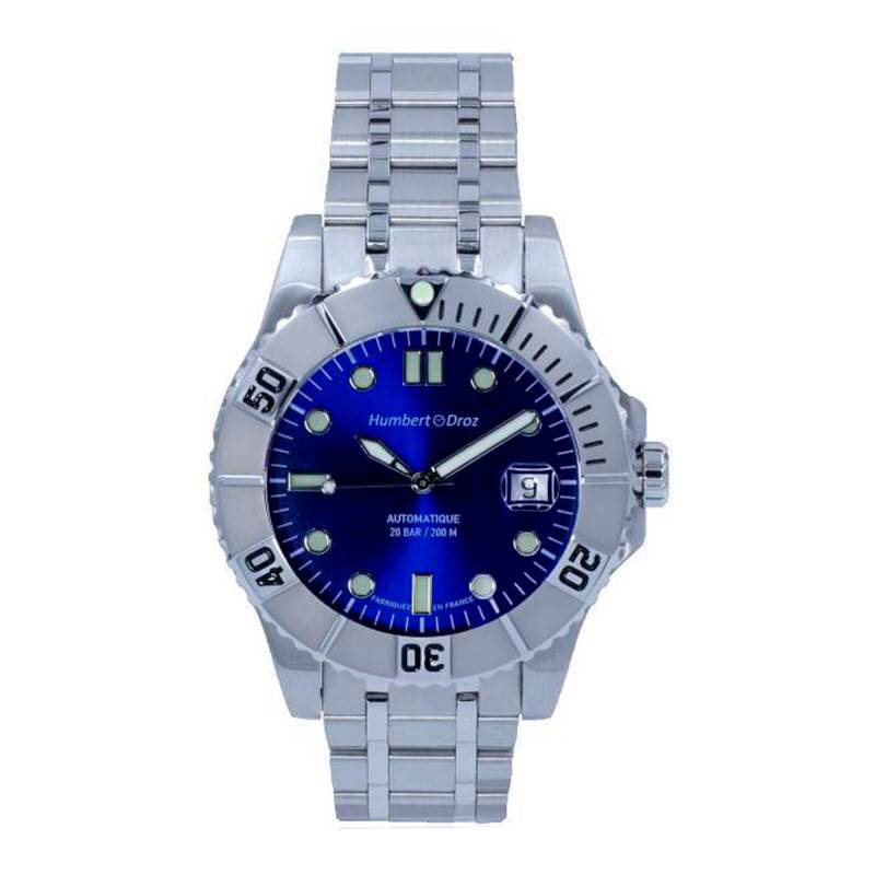 Humbert-Droz est une marque française générationnelle qui perpétue un grand savoir-faire depuis déjà quatre générations. Afin de vous parer avec distinction et vous permettre de faire de ces montres des accessoires qui traversent les générations, elle les conçoit avec des matériaux durables et des designs intemporels. Leurs garde-temps sont soignés et racontent une histoire que vous serez fiers de transporter partout avec vous. À travers sa collection HD9, Humbert-Droz vous présente 5 montres rendant hommage aux océans. Celle que nous vous présentons ici est inspirée de l'Atlantique. Elle dispose d'un boîtier affichant un diamètre de 45 mm, une épaisseur de 13 mm et une longueur de 50 mm. Ses dimensions sont typiquement adaptées aux poignets de la gent masculine. Sur ce dernier, se trouve une lunette crantée et unidirectionnelle à 120 clics qui se trouve graduée par un chemin de fer des minutes et un repère luminescent. Elle vous servira à calculer le temps écoulé lors de l'immersion et entoure un verre saphir plat qui s'avérera très résistant et protégera le cadran des chocs extérieurs et des rayures auxquelles il est exposé quotidiennement. Vous pourrez régler les heures, les minutes et la date au moyen de la couronne vissée gravée par le logo placée à 3 heures. Le fond de boîte de ce garde-temps est vissé et transparent, donnant une vue d'ensemble sur les rouages du mécanisme et assure une étanchéité de 20 ATM.