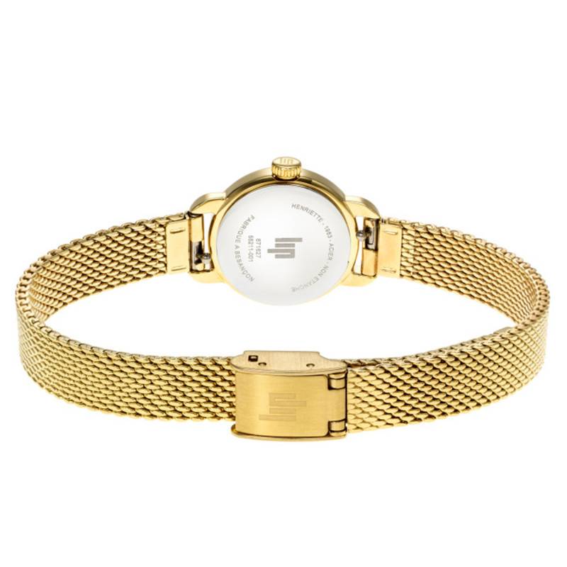 La Montre Lip Henriette Classique incarne l'essence même de l'élégance féminine avec son design soigné et ses caractéristiques minutieusement choisies. Le boîtier rond, d'un diamètre élégant de 18,50 mm, est conçu en acier recouvert d'une finition PVD jaune polie et brillante, lui conférant un aspect à la fois luxueux et discret. Ce design délicat est complété par un verre bombé minéral. Le boîtier présente une couronne unique située à droite, utilisée pour ajuster l'heure avec précision.