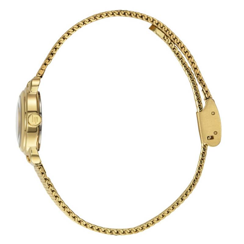 Le bracelet de cette montre est conçu en acier avec une finition en maille milanaise, une technique qui confère un incomparable confort et un ajustement parfait au poignet. Recouvert d'un traitement PVD Gold, il affiche une teinte jaune qui complète harmonieusement le boîtier de la montre. Doté d'une boucle clipable, il assure une mise en place et un retrait aisés. L'entrecorne de 8 mm renforce son aspect délicat et féminin, tout en offrant la robustesse nécessaire pour un usage quotidien.