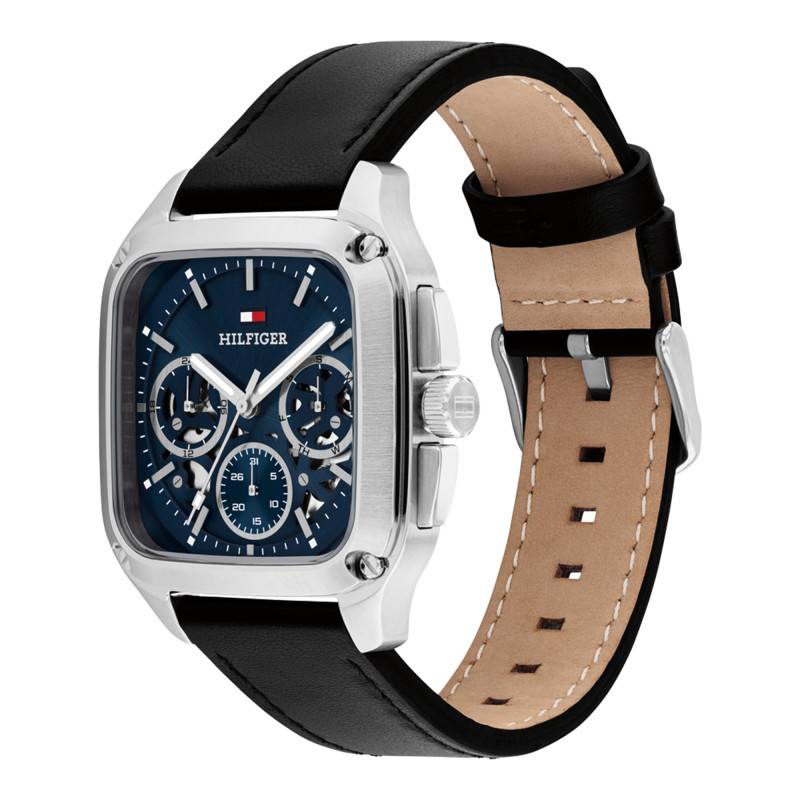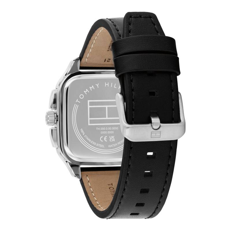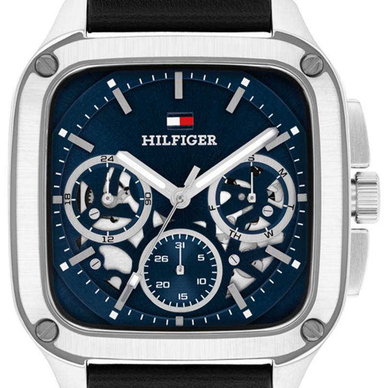 La montre Herald de la marque Tommy Hilfiger se distingue par son design audacieux et contemporain. Conçue pour l'homme moderne, elle est à la fois robuste et élégante avec un boîtier en acier inoxydable de forme rectangulaire. Le diamètre du boîtier de 39 mm et une épaisseur de 10 mm en font une pièce confortable à porter au quotidien sans compromis sur le style. Pesant 66 grammes, elle offre une présence certaine sur le poignet. La lunette fixe en acier ajoute une touche de solidité et de sophistication, accentuée par une finition mate brossée. L'ensemble est couvert par un verre minéral de forme plate, assurant une résistance aux chocs modérés et une lisibilité parfaite.