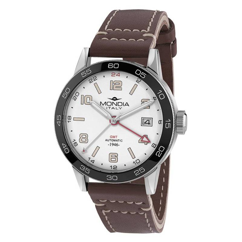 Le cadran blanc mat de la montre Mondia est orné de chiffres arabes en relief, offrant une lisibilité optimale. Les aiguilles, dotées d'une matière luminescente, permettent une lecture facile même dans l'obscurité, tandis que l'affichage analogique assure une élégance intemporelle. Un guichet date est discrètement situé à 3 heures, harmonisant fonctionnalité et style. Autour du cadran, la lunette marquée des heures GMT facilite le suivi de deux zones horaires simultanément, rendant ce modèle idéal pour le voyageur moderne. Le verre minéral protège l'ensemble, garantissant une résistance contre les chocs du quotidien, tout en préservant la beauté impeccablement photographiée de son visage.