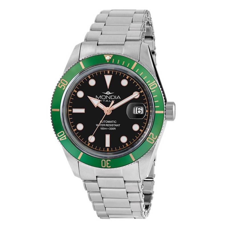 Mondia a été fondée en 1935 par Armond Waszme dans la ville de La Chaux-de-Fonds. C'est une marque suisse qui s'est fait connaître pour ses multiples créations sophistiquées qui ont révolutionné le domaine de l'horlogerie moderne. Elle propose des modèles faits à partir d'un savoir-faire traditionnel afin de vous proposer la meilleure qualité. Soucieuse de magnifier l'allure des hommes, elle vous met à disposition cette montre Heritage Diver MI-821-SGRPR-BK-OY. Elle arbore un boîtier en acier inoxydable 316L gris de forme ronde qui est magnifié sur la surface par une finition brossée et sur les côtés par une allure polie. Mesurant 42 mm de diamètre sur 10 mm d'épaisseur, il se posera avec délicatesse sur tous les poignets masculins. Il abrite une lunette bidirectionnelle crantée qui à son tour porte un insert vert affichant un chemin de fer des minutes et un repère luminescent. Son merveilleux cadran se dissimule sous un verre minéral bombé et il présente des éléments qui se régleront grâce à la couronne grise crantée et vissée qui lui octroie une meilleure prise en main. Enfin, veuillez noter que le modèle affiche un fond de boîte vissé qui lui garantit une étanchéité fiable de 10 ATM.