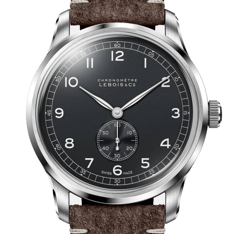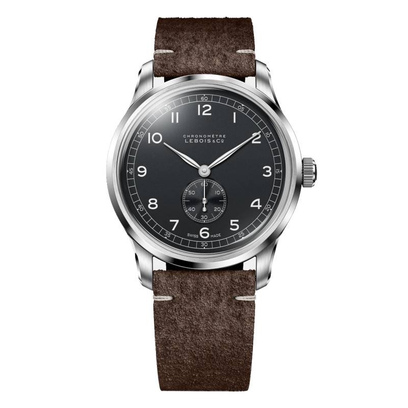 Le cadran de cette montre Lebois & Co est une véritable œuvre d'art grâce à sa finition mate qui crée un contraste subtil avec les chiffres arabes clairs et précis. La profondeur de la couleur noire du cadran est accentuée par des index et un chemin de fer des minutes intégré qui apportent une touche supplémentaire de sophistication. Ce cadran intègre également un compteur additionnel pour la petite seconde à 6 heures, assurant une lecture du temps précise. L'éclat des aiguilles argentées ajoute encore à l'élégance de cette exceptionnelle pièce horlogère.
