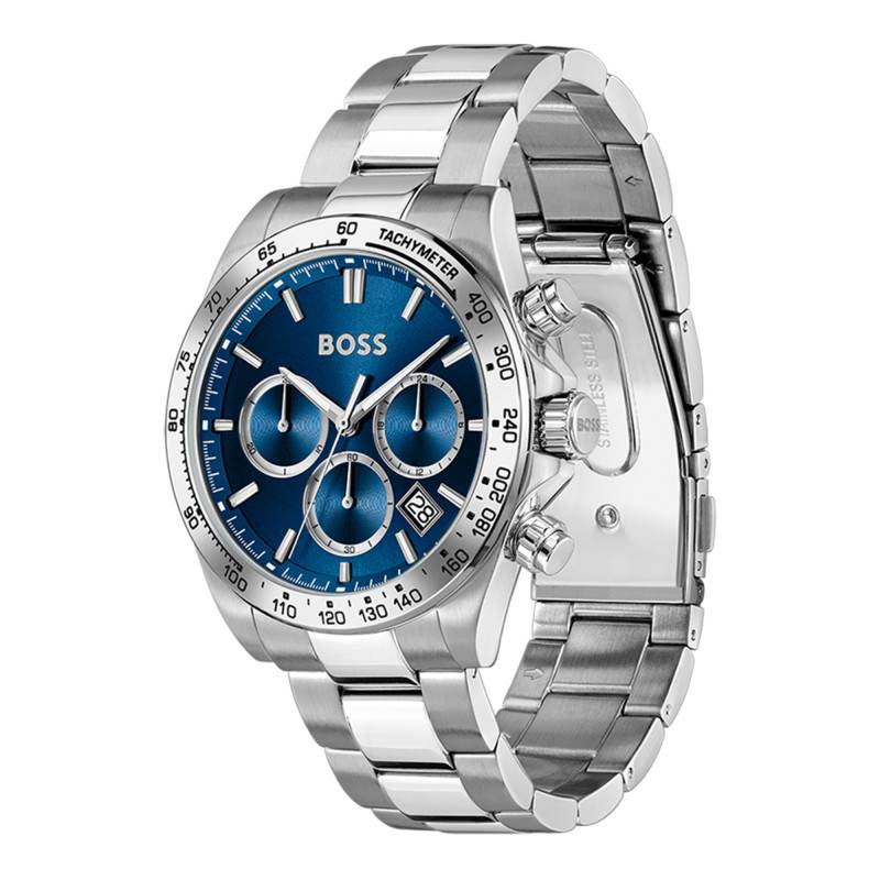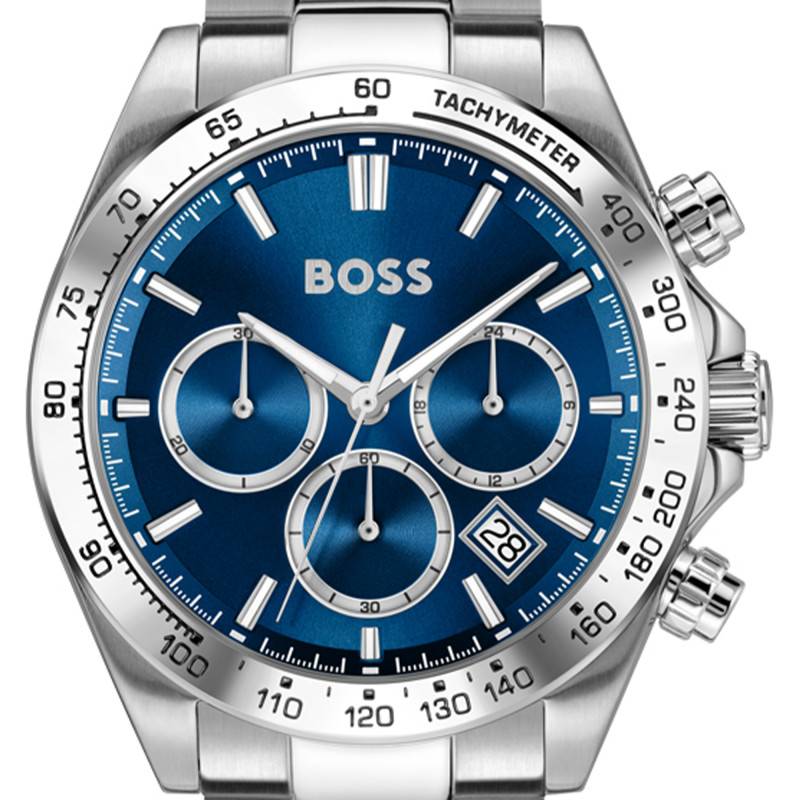 Le cadran de cette montre Boss Hero 2.0 est une démonstration de raffinement technique et esthétique. Le cadran bleu bénéficie d'une finition soleillée qui crée des jeux de lumière captivants tout au long de la journée. Les index, tout comme les aiguilles luminescentes, se détachent avec élégance sur le fond sombre, garantissant une lisibilité optimale. La montre affiche les heures, les minutes et les secondes de manière analogique, avec un guichet qui intègre discrètement la date à la position quatre heures. Trois compteurs additionnels sont judicieusement placés pour apporter des fonctions chronographiques, incluant un totalisateur 24 heures, 60 minutes et secondes. L'échelle tachymétrique sur la lunette, en harmonie avec les éléments du cadran, est particulièrement utile pour les calculs de vitesse, rendant ce modèle autant fonctionnel qu'esthétiquement attrayant.