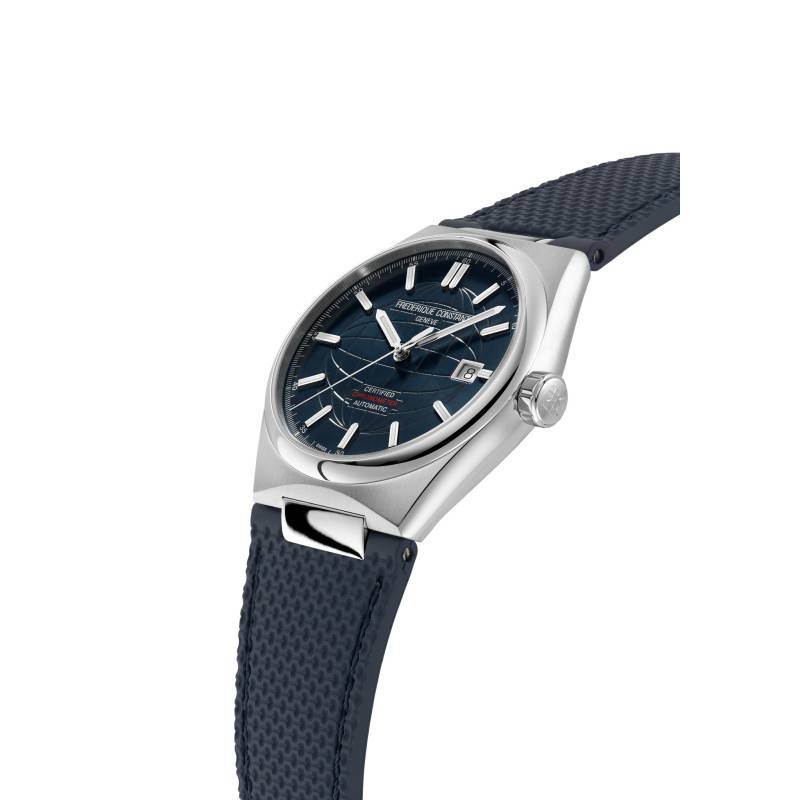 La maison horlogère suisse Frédérique Constant vous propose des montres de qualité avec un design unique et intemporel. Elles sont parfaites pour le quotidien, et vous offrent des innovations qui séduiront les fans de montres avertis. Elle vous présente aujourd'hui sa nouvelle Montre Highlife Automatic COSC FC-303BL3NH6B. Elle se compose d'un boîtier en acier inoxydable qui affiche un diamètre de 39 millimètres pour une épaisseur de 10.34 millimètres. Parfait pour se poser sur les poignets des hommes. Il est recouvert par un verre saphir convexe qui vous donne une grande résistance qui pourra faire face aux chocs et aux rayures que le quotidien peut occasionner. Sur la droite, un bouton remontoir manuel vient se placer dans la continuité des trois heures pour vous permettre de régler les éléments du cadran sans difficulté. Au niveau du dos, vous pourrez admirer le sublime mouvement automatique en action grâce à son fond de boîte transparent. Ce fond est maintenu par des vis et vous offre une étanchéité de 5 ATM, soit 50 mètres.