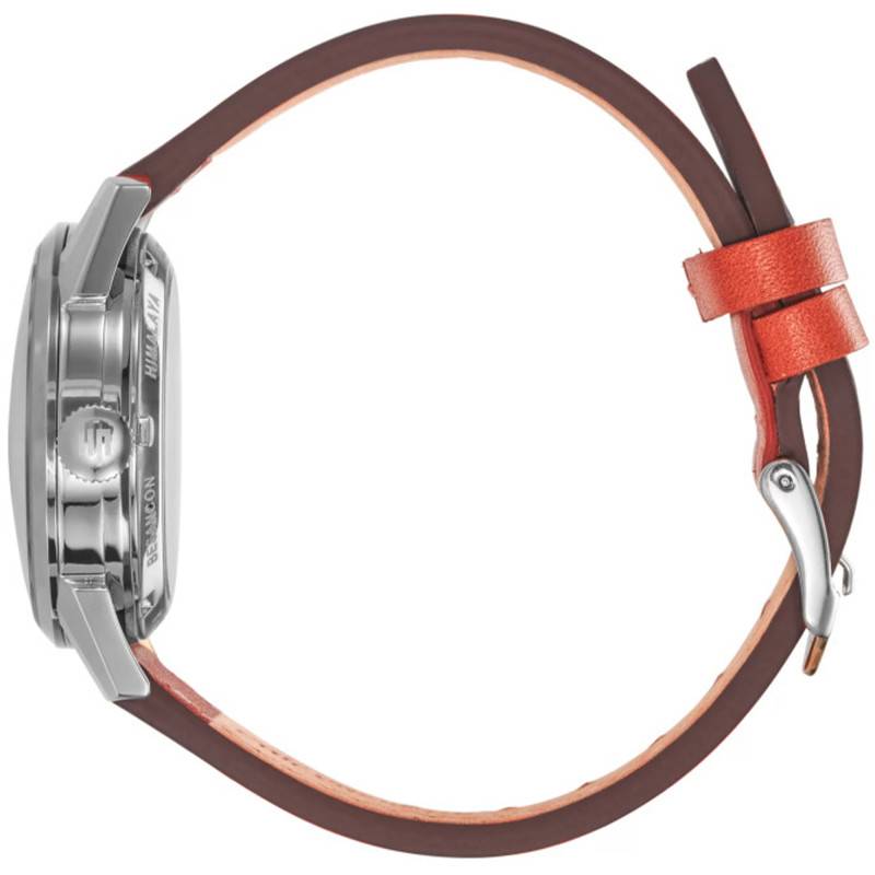 Ce magnifique boîtier est accompagné d'un bracelet en cuir de vachette de couleur orange qui apporte un peu d'originalité à cette montre. Il se voit souple et résistant grâce à sa matière. Il dispose de surpiqûres ton sur ton qui viennent compléter ce look vintage. Vous n'aurez aucun mal à le refermer grâce à sa boucle ardillon argentée. À noter que son entrecorne mesure 16 mm.