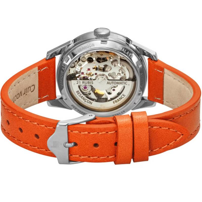 La maison Lip vous propose sa nouvelle montre de la collection Himalaya Sablier pour femme. Elle saura vous séduire avec son sublime cadran et son bracelet en cuir de vachette orange. Ce modèle est inspiré de la passion que Fred Lip avait pour la montagne et fait référence à la première ascension de l'Annapurna I qui est une montagne de l'Himalaya. Revenons en a notre modèle Himalaya sablier. Il dispose d'un boîtier en acier inoxydable 316 L qui se voit plus résistant à la corrosion. Il mesure 33.5 millimètres de diamètre, ce qui est la taille idéale pour un poignet féminin. Une couronne remontoir crantée vient se positionner à droite de ce sublime boîtier et vous permettra de régler manuellement les aiguilles au sein de ce cadran. D'ailleurs, un verre saphir vient se loger au-dessus de celui-ci et le protégera des éventuels chocs et rayures occasionnés par le quotidien. Enfin, cette montre dispose d'un fond de boîte transparent et vissé qui vous garantit une étanchéité de 50 mètres de profondeur.