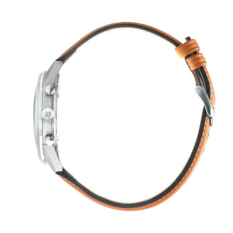 De part et d'autre du boîtier en acier poli se pose, un bracelet en cuir marron. Ce dernier adopte à la fois un style classique et intemporel, permettant de revêtir ce garde-temps à travers les générations. Par ailleurs, il est entièrement constitué de cuir de vachette marron clair et possède une finition lisse. Sur les extrémités se posent des surpiqûres beiges, pour un rendu travaillé au poignet. Vous noterez que l'entre-corne de ce bracelet s'élève à 20 millimètres et qu'une boucle ardillon argentée et éclatante sert de fermoir.
