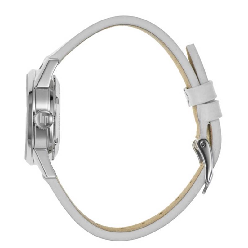 Le bracelet de la montre, en cuir blanc de bovin, offre une sensation douce au toucher et une flexibilité qui s'adapte à tous les poignets. La largeur de l’entrecorne de 14 mm assure un ajustement parfait de la montre, complété par une boucle ardillon qui garantit sécurité et facilité d'utilisation.