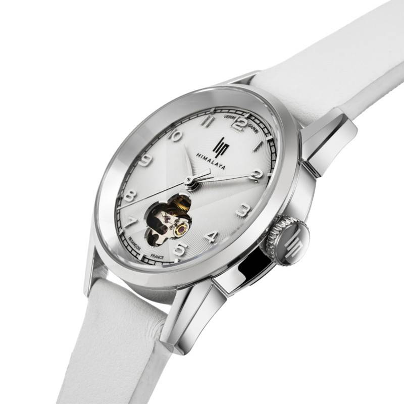 Le cadran, véritable pièce de résistance de cette montre, est orné d'une ouverture en ''cœur ouvert'', laissant entrevoir son précieux mécanisme automatique. Le choix de chiffres arabes et d'index affublé d'un chemin de fer assure une lisibilité optimale. La palette des couleurs blanche et grise, subtilement utilisée, enrichit cette montre d'un éclat sobre mais distinctif. La précision des détails est soulignée par la présence d'un unique bouton remontoir qui renforce l'esthétique épurée du modèle.