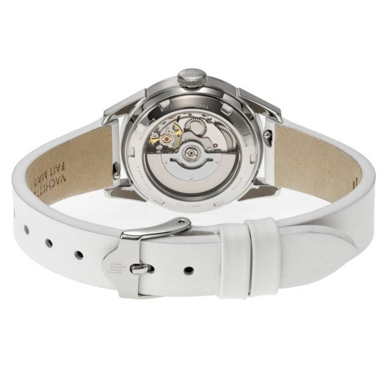 Le bracelet de la montre, en cuir blanc de bovin, offre une sensation douce au toucher et une flexibilité qui s'adapte à tous les poignets. La largeur de l'entrecorne de 14 mm assure un ajustement parfait de la montre, complété par une boucle ardillon qui garantit sécurité et facilité d'utilisation.