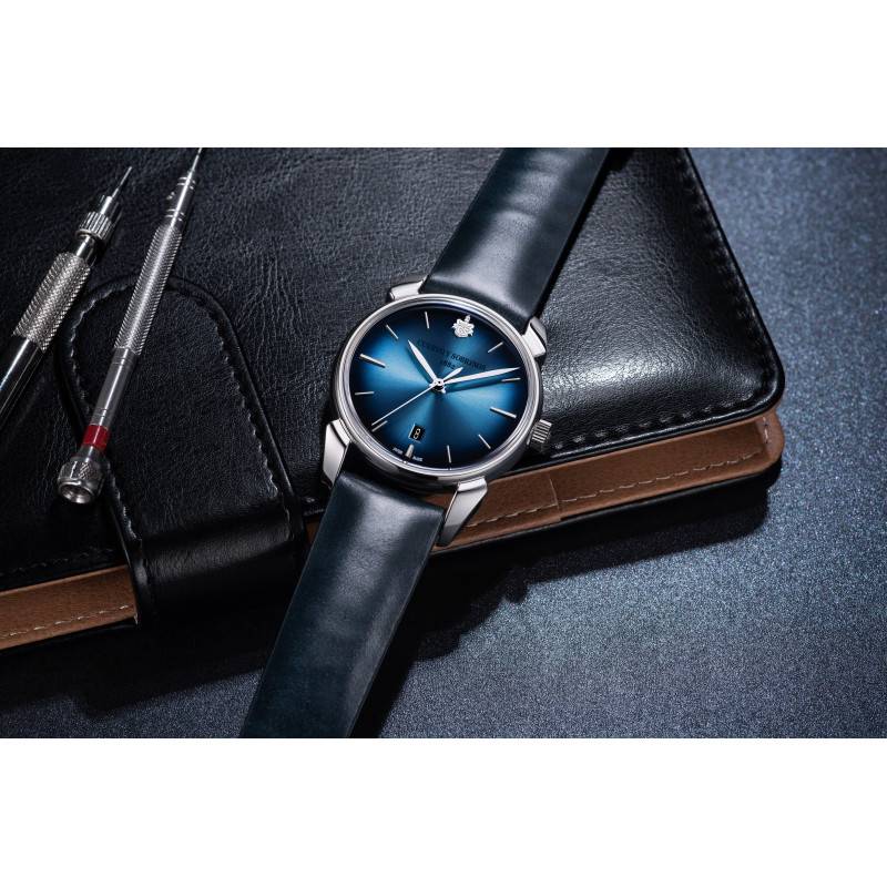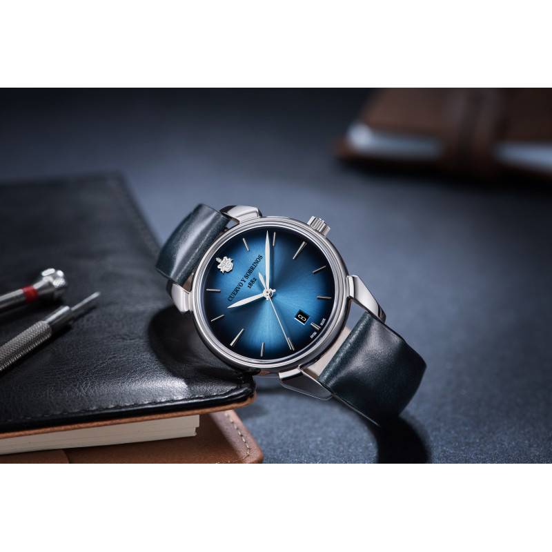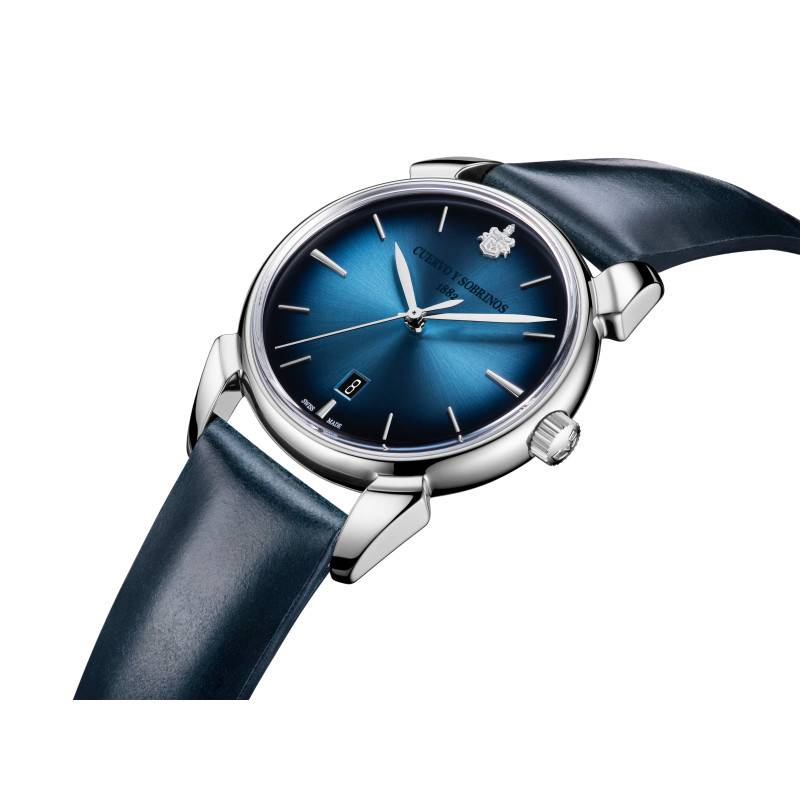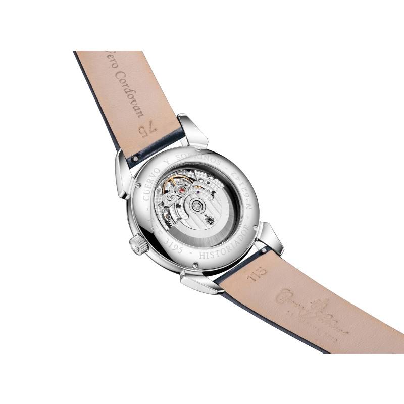 La maison Cuervo Y Sobrinos vous propose des montres tendances et élégantes au design directement inspiré de Cuba, le pays d'origine de la marque. De plus, elle y ajoute un savoir-faire de qualité tout droit venu de la Suisse. Aujourd'hui, elle est fière de vous présenter sa nouvelle Montre Historiador Asturias 3195.1ASB remplie d'élégance. Elle se compose d'un boîtier fait en acier inoxydable qui affiche un diamètre de 40 millimètres pour une épaisseur de 9,9 millimètres afin de se poser sur les poignets des hommes comme des femmes. De plus, il dispose d'une finition polie qui fait ressortir le cadran central. Ce dernier est recouvert par un verre saphir qui lui offre une grande protection face aux chocs et aux rayures que le quotidien peut occasionner. Notez que cette montre vous garantit une étanchéité de 3 ATM grâce à son fond de boîte maintenu par des vis et transparent qui vous laissera admirez le sublime mouvement automatique.