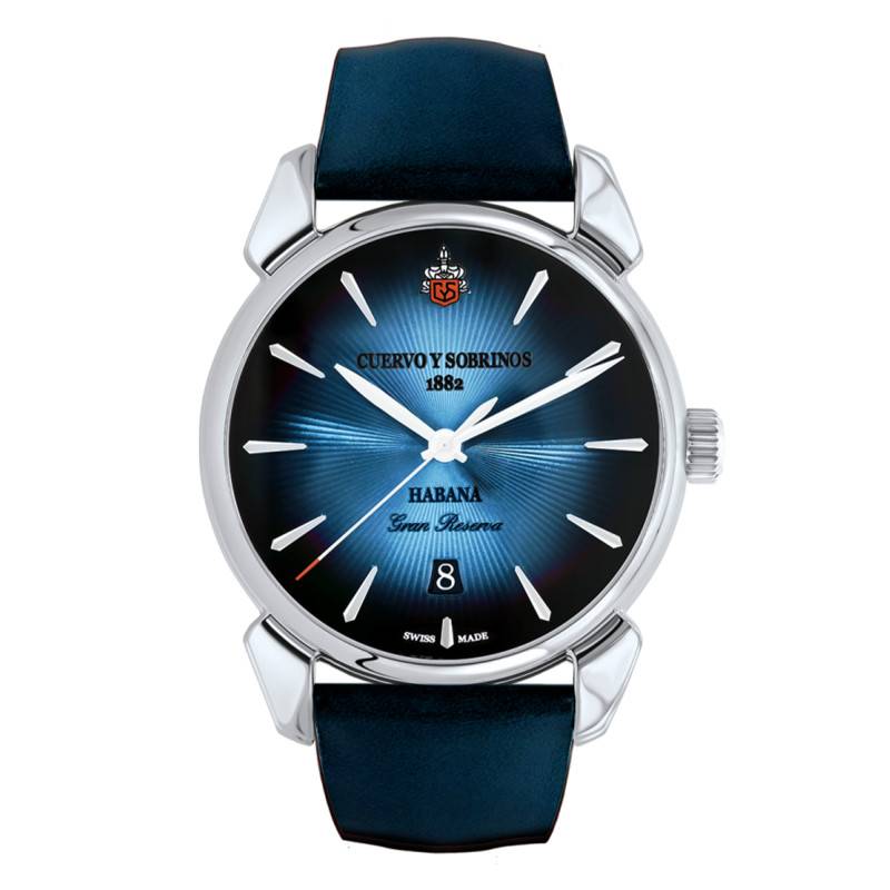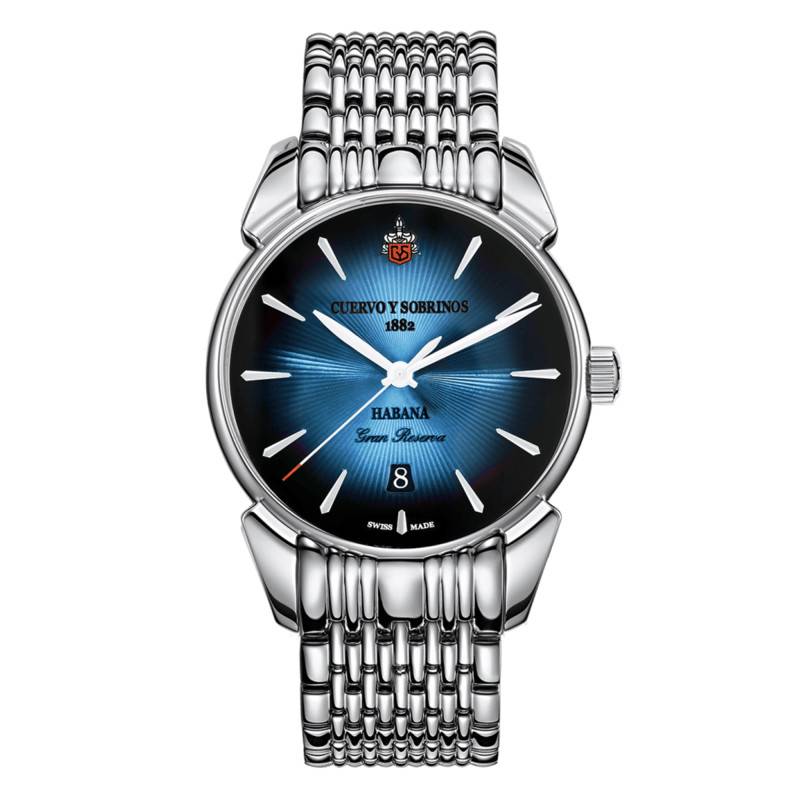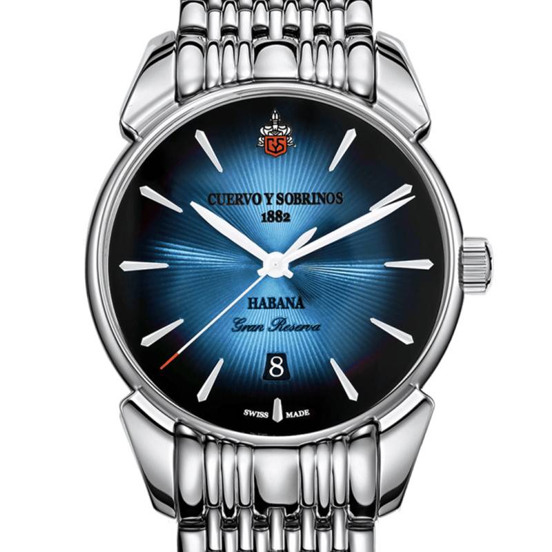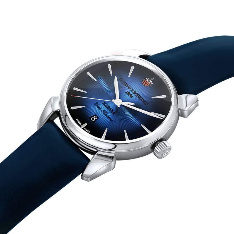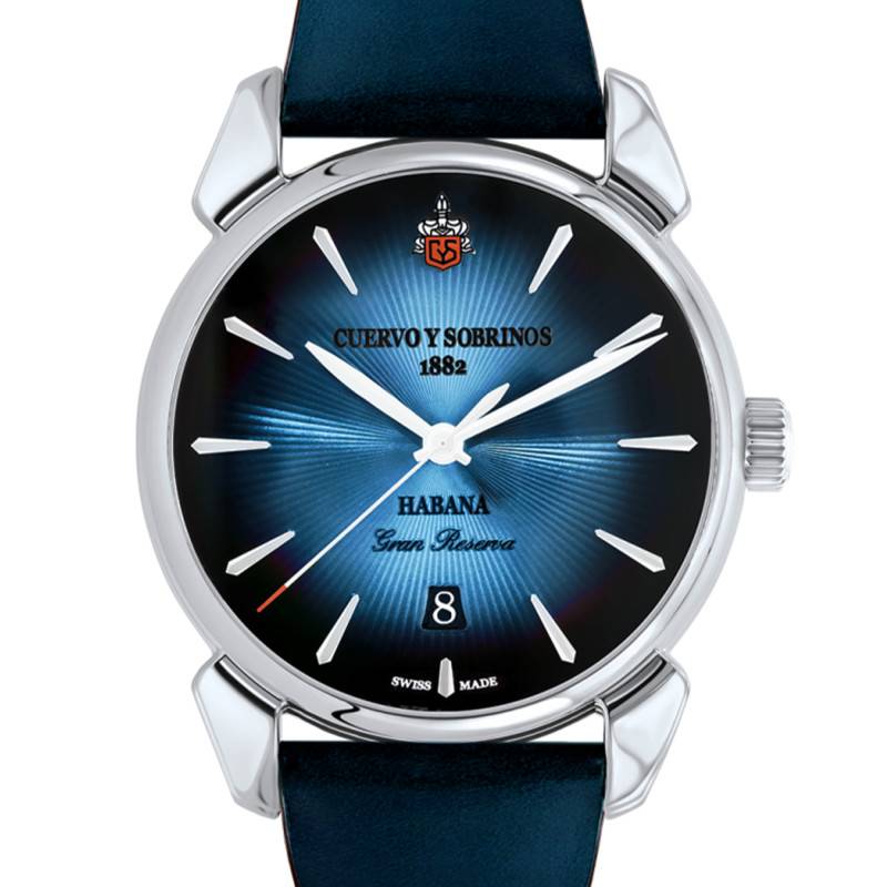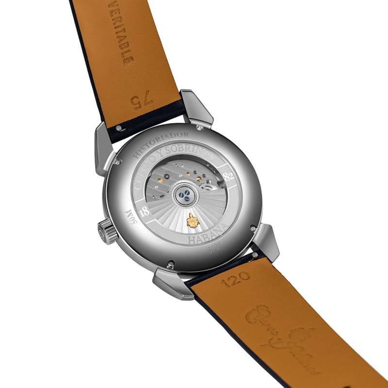 Évoquons l'élégance formelle et la sophistication technique de cette montre Cuervo y Sobrinos Historiador Bleu. Sa construction met en avant un boîtier en acier inoxydable 316L, garni d'une finition polie qui sublime son allure. De forme ronde, le boîtier mesure 40,00 mm de diamètre et 10,85 mm d'épaisseur, assurant une présence assurée et confortable au poignet. La montre est dotée d'un verre bombé en saphir traité antireflet pour une lisibilité parfaite. Le fond est transparent, apportant une touche contemporaine et permettant de voir les rouages du mécanisme.