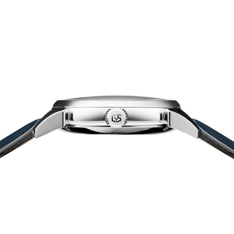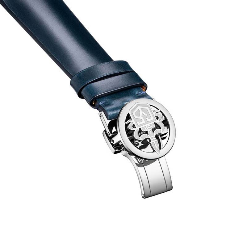 Le choix du bracelet contribue largement à l'identité de cette montre. Disponible en acier inoxydable 316L avec une boucle déployante ou en cuir de veau avec une boucle ardillon, chaque version met en valeur le style et le confort. L'acier poli assure une continuité impeccable avec le boîtier, tandis que le cuir offre la chaleur et le raffinement d'un accessoire classique. Chacune de ces options peut être sélectionnée facilement via le menu déroulant.
