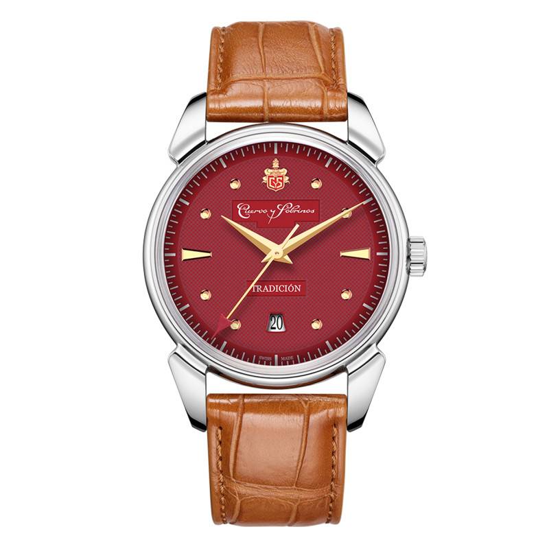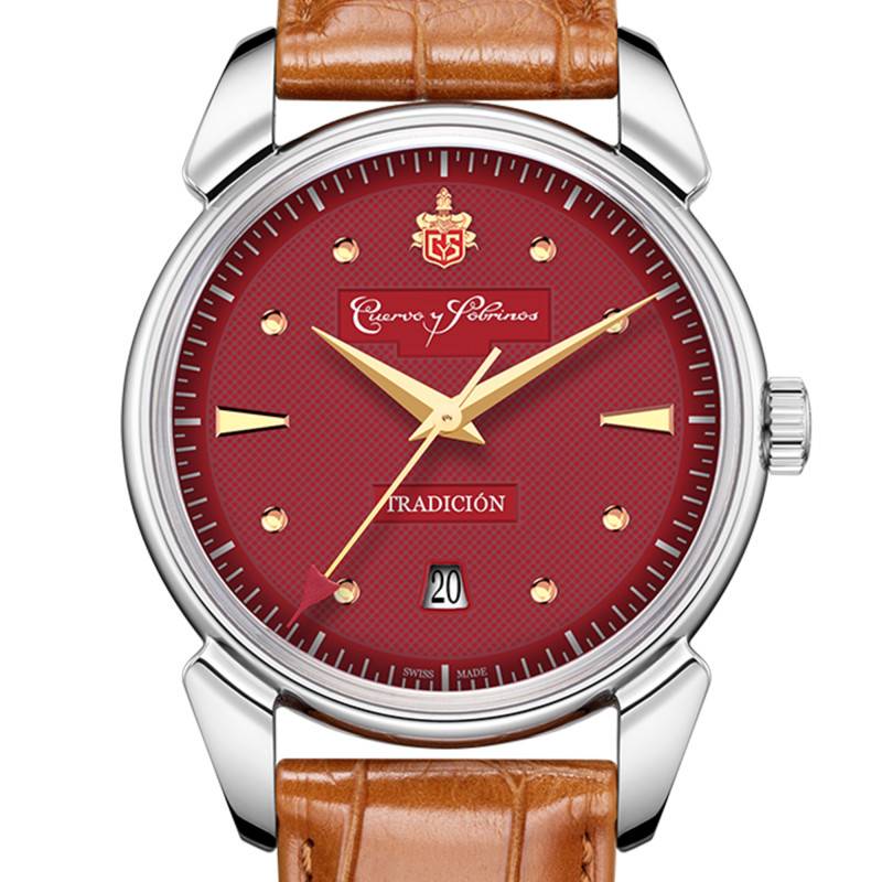 La montre Cuervo y Sobrinos Historiador Tradición Burgundy 3195.1TBY se distingue par un design à la fois classique et sophistiqué. Avec son boîtier en acier inoxydable 316L de 40,00 mm de diamètre et 12,30 mm d'épaisseur, elle offre une présence imposante sans sacrifier le confort. Ce garde-temps arbore une forme ronde élégante, symbolisant l'harmonie et la tradition dans l'horlogerie. Conçu pour les amateurs de montres raffinées, le fond de boîte transparent révèle le mécanisme intérieur, exposant ainsi sa complexité et sa précision mécanique. En tant qu'édition limitée à 282 exemplaires, c'est une pièce de collection qui capture l'esprit de Cuervo y Sobrinos.