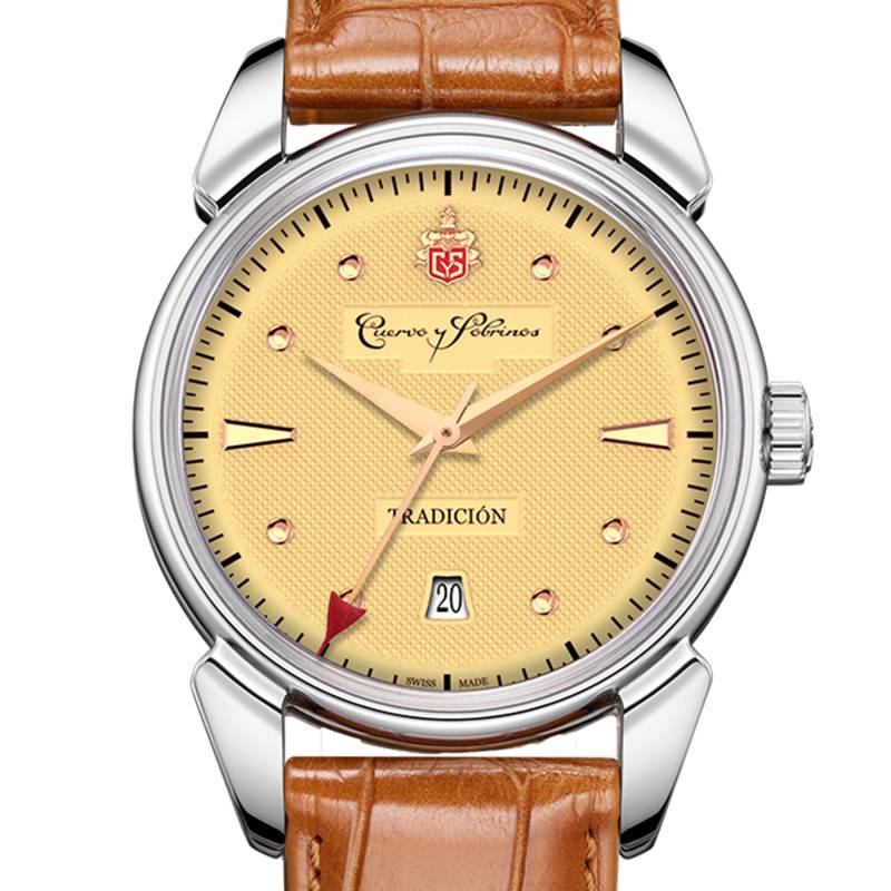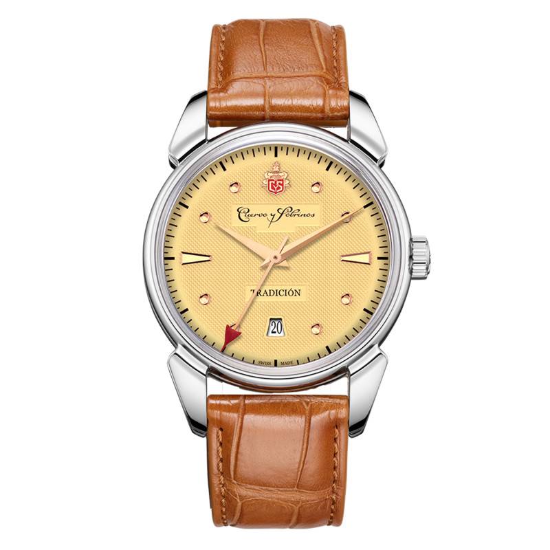 La Cuervo y Sobrinos Historiador Tradición Champagne se distingue par son allure captivante, mariant tradition et modernité. Son boîtier rond en acier inoxydable 316L offre non seulement une robustesse remarquable mais également un aspect poli élégant qui attire immédiatement le regard. Mesurant 40,00 mm de diamètre et 12,30 mm d'épaisseur, ce boîtier présente des proportions idéales pour un confort sur le poignet tout en affirmant une présence distinctive. Le fond du boîtier est transparent, permettant d'admirer le mouvement interne, une caractéristique prisée par les connaisseurs. Cette montre est une édition limitée à 282 exemplaires, conférant une exclusivité à ce véritable bijou horloger suisse.