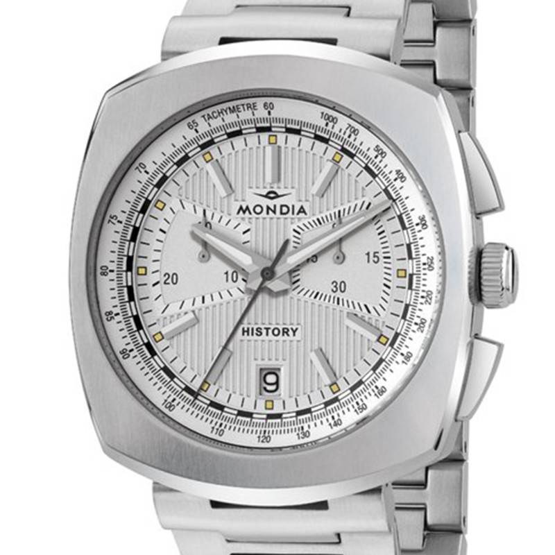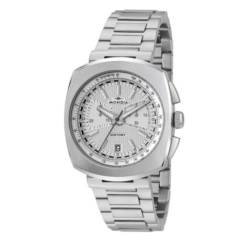 La montre Mondia History arbore un design robuste synonyme de masculin et d'élégance contemporaine. Fabriqué en acier inoxydable, le boîtier est développé dans une magnifique forme de coussin, combinée avec une finition mate brossée qui confère à la montre une apparence raffinée et solidement manufacturée. Avec un diamètre de 40 mm et une épaisseur de 14 mm, cette montre est conçue pour se démarquer sur le poignet, tout en offrant un confort optimal grâce à sa construction équilibrée.