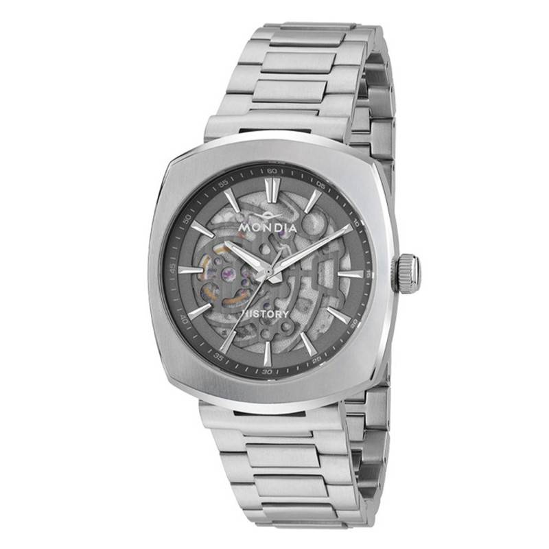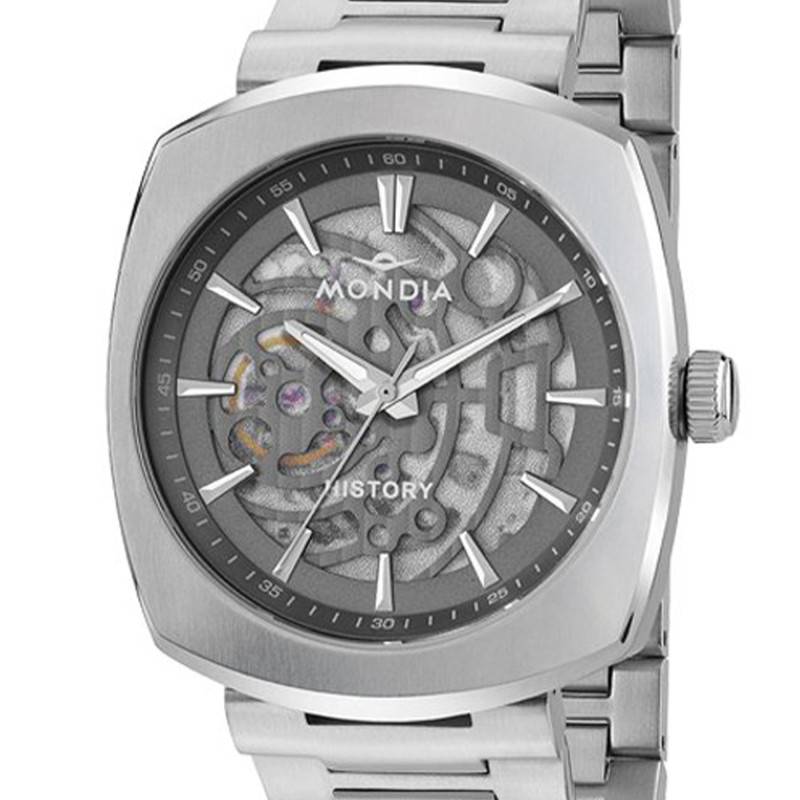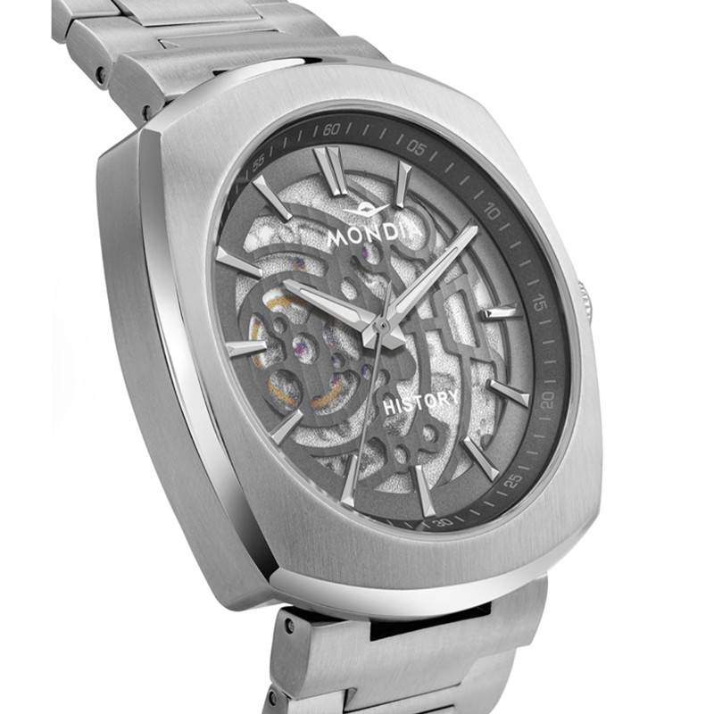 Le cadran de la Mondia History est une ode à l'artisanat horloger moderne, avec un affichage squeletté qui dévoile la complexité et la beauté de son mécanisme interne. Les aiguilles luminescentes offrent une lecture facile dans l'obscurité, tandis que les chiffres arabes associés à des index clairs et un chemin de fer des minutes assurent une lisibilité immédiate. La subtile couleur grise du cadran s'harmonise parfaitement avec l'acier de la boîte, créant une allure monochrome et élégante.