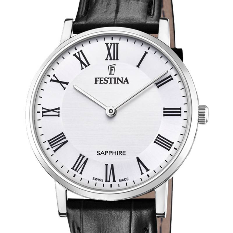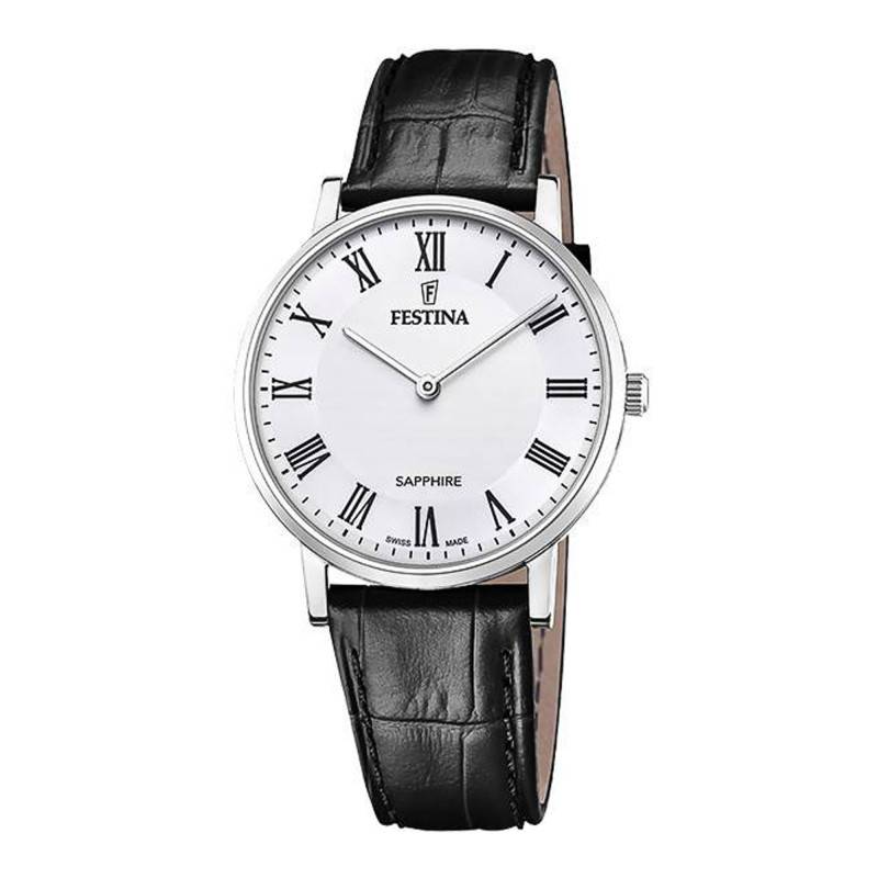 Adoptez un look simple et élégant avec un cadran de forme arrondie et de couleur blanche. Au coeur de ce dernier, deux aiguilles argentées vous indiqueront les heures et les minutes avec précision. Un chemin de fer des minutes, ainsi que des index des heures noirs représentées par des chiffres romains, vous offriront une meilleure lisibilité et une lecture des heures plus approfondie. Enfin, la marque Festina signe son nom sous l'index de douze heures et rappelle la qualité du verre au-dessus de l'index de six heures.
