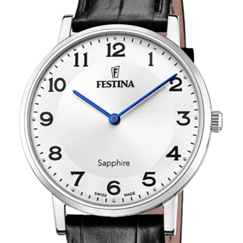 Forte de plus de 100 ans d'expérience dans le domaine de l'horlogerie, Festina propose des garde-temps de qualité qui combinent esthétique et technicité. Elle présente cette montre Swiss Made F20012/5 qui allie élégance et modernité avec une touche classique. Elle est livrée avec un boîtier rond conçu en acier inoxydable et mesurant 39,30 mm de diamètre et 6,70 mm d'épaisseur. Celui-ci est surplombé par un verre saphir plat qui protège parfaitement le cadran contre les rayures. Sur le côté droit se trouve la couronne crantée qui assure le réglage des heures et des minutes. Enfin, le fond de boîte vissé promet une étanchéité de 5 ATM.