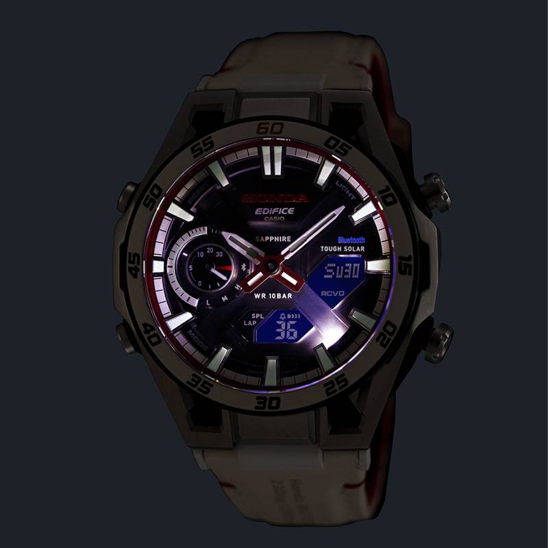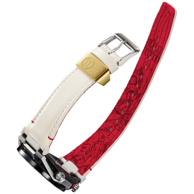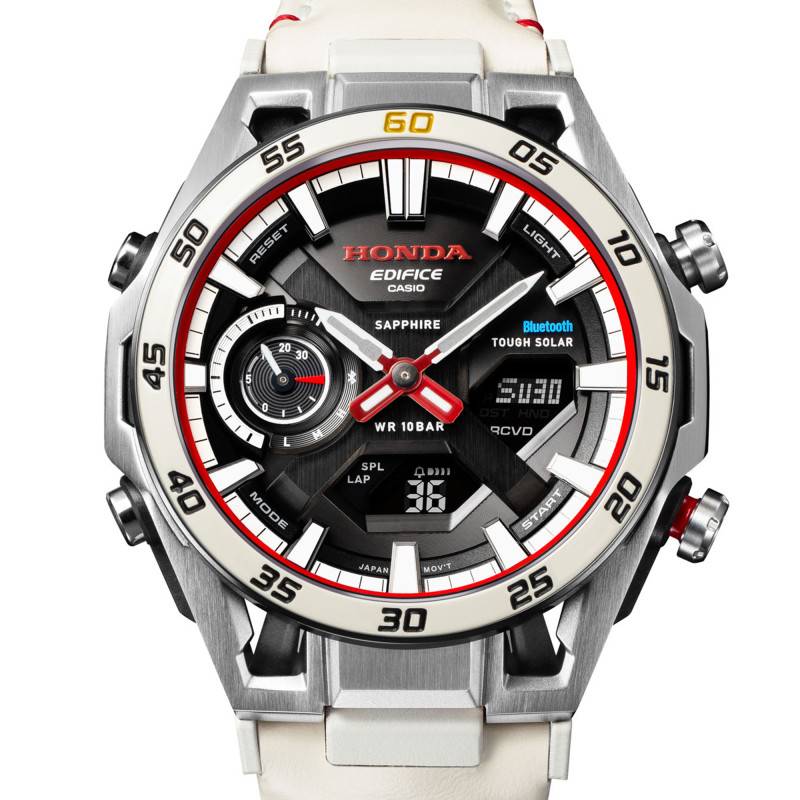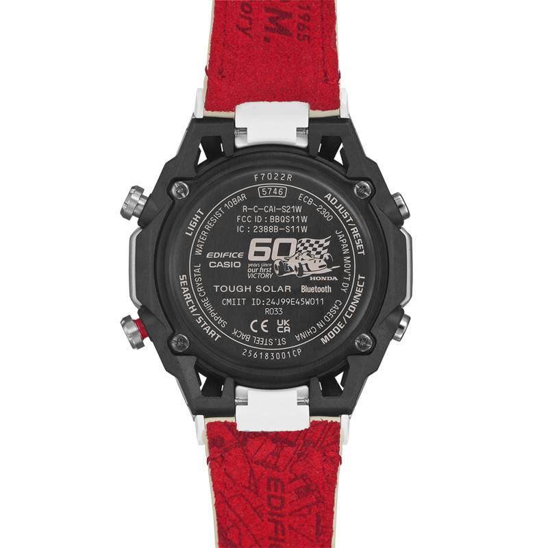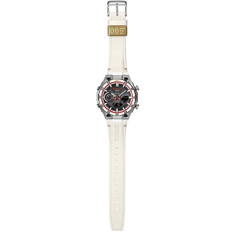 La montre Casio Edifice Honda F1 First Victory 60ᵉ Anniversaire est un hommage saisissant à la première victoire de Honda en F1 il y a 60 ans. La conception impressionnante du boîtier en acier inoxydable et carbone évoque la robustesse et l'élégance d'une époque légendaire. Avec ses dimensions d'une longueur de 50,20 mm, une largeur de 45,80 mm, et une épaisseur de 11,50 mm, elle combine parfaitement présence et confort au poignet. Le fond maintenu par des vis, ainsi que sa finition mate brossée/satinée, lui confèrent une élégance industrielle moderne. Le boîtier tonneau, accompagné de quatre boutons-poussoirs bien placés, reflète une esthétique masculine affirmée. Sur la boucle en métal doré du bracelet, les mots "Veni, Vidi, Vici" sont gravés avec le numéro 11 du pilote Richie Ginther, ajoutant une touche de sophistication historique.