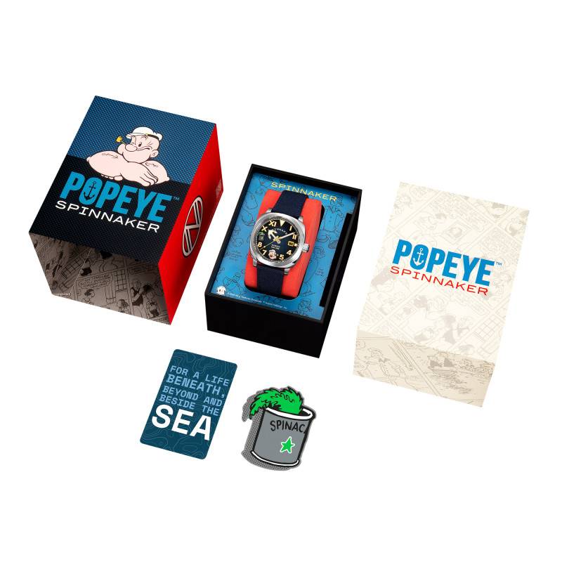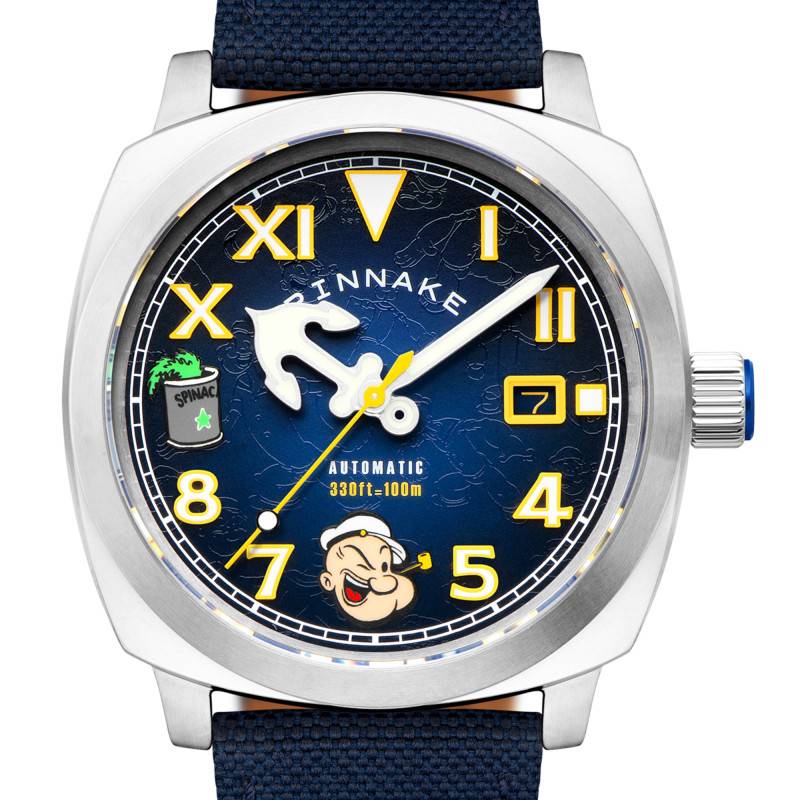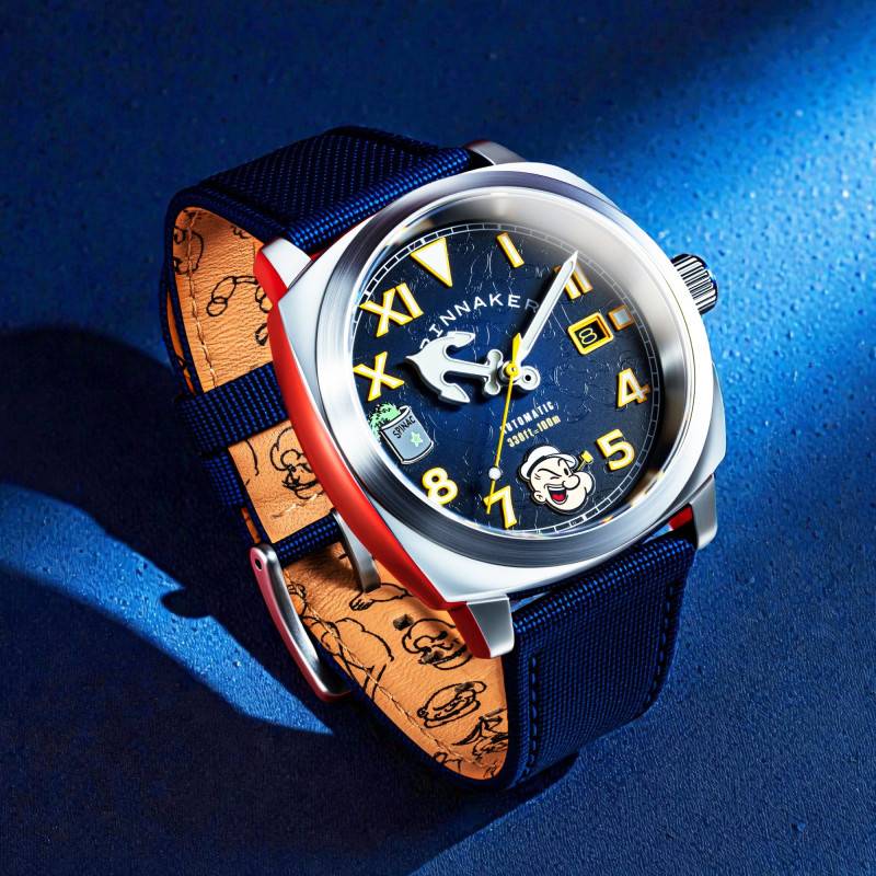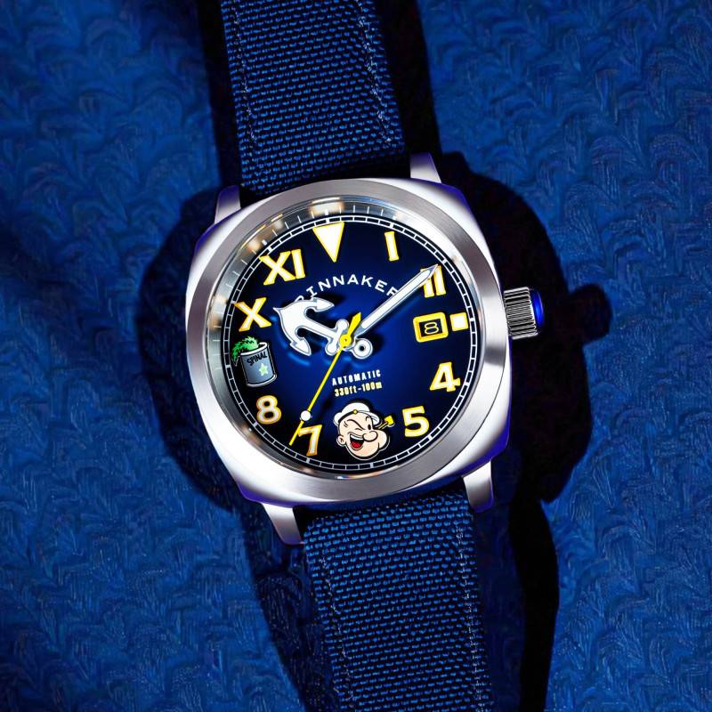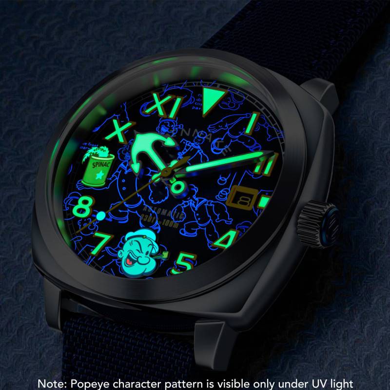 Le cadran de cette montre est un véritable hommage à la créativité et à l'iconique personnage de Popeye. De couleur bleu, il affiche une série unique de détails, avec des chiffres arabes pour la plupart des heures et des chiffres romains aux positions 6 et 12 heures. Les aiguilles et les index sont recouverts de SuperLuminova, permettant une lisibilité optimale même dans des conditions de faible luminosité. L'intégration prudente de motifs et d'illustrations apporte une touche ludique et artistique à l'ensemble. Le guichet date placé à 3 heures se fond harmonieusement dans le design tout en offrant une fonctionnalité précieuse.