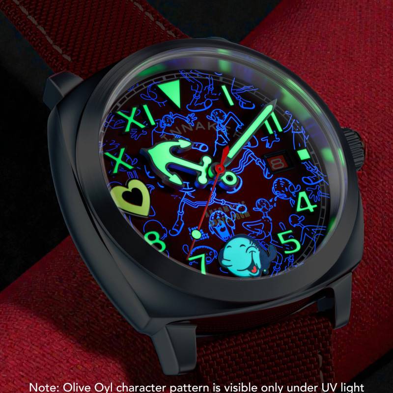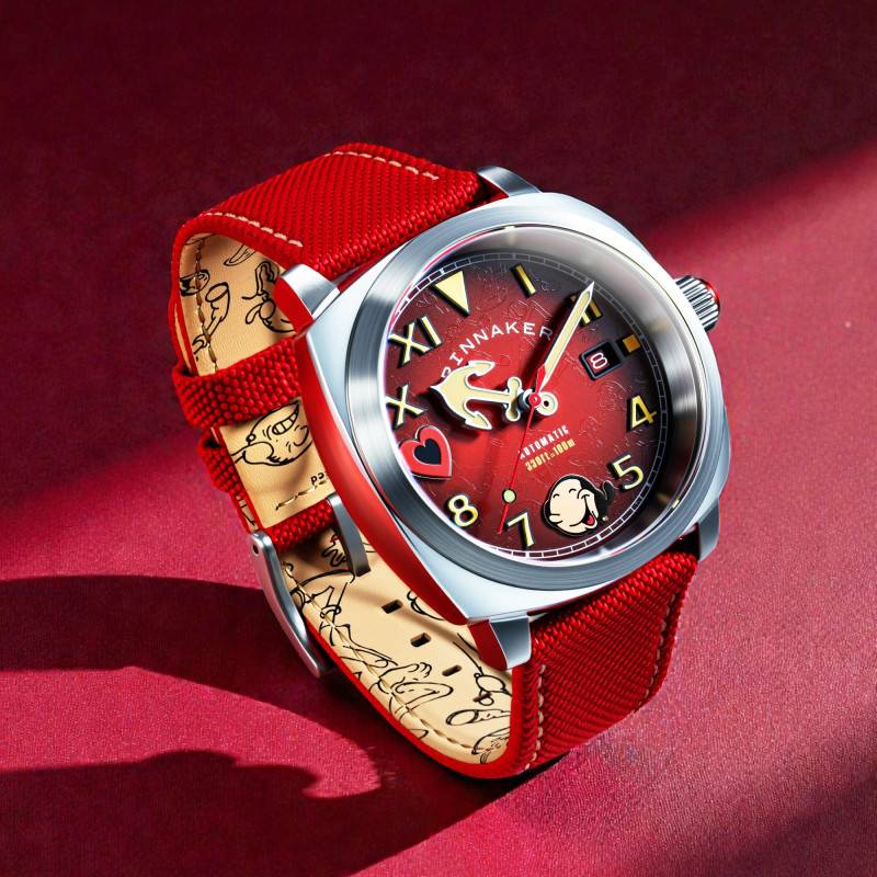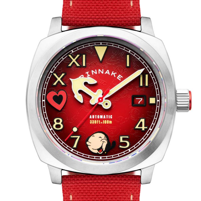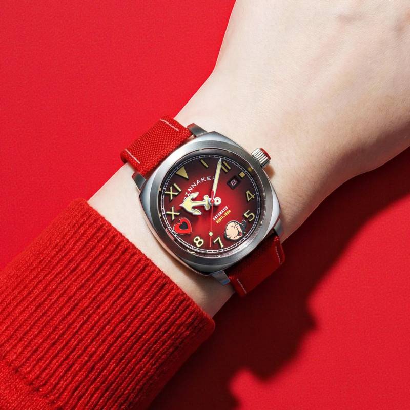 Le cadran de cette montre révèle toute sa personnalité avec un fond rouge vibrant. La combinaison de chiffres arabes et romains apaise les conventions et apporte un style éclectique. Chaque chiffre et index est marqué par un traitement SuperLuminova, garantissant lisibilité et éclat même dans l'obscurité la plus totale. Le design est rehaussé par des éléments inspirés de Popeye, ajoutant une note ludique à cette merveille mécanique. Le verre saphir, bombé et traité antireflet, assure une protection optimale tout en augmentant la clarté du cadran.