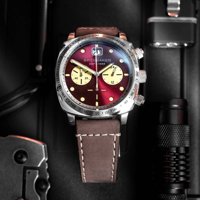 Vous allez adorer ce superbe cadran de forme ronde aux nuances rouge bordeaux. Il allie style urbain et sobriété pour vous offrir une lecture du temps avec clarté. Il est magnifié par une double finition soleillée et fumée qui ajoutent une note distinctive à l'ensemble. Son pourtour argenté est marqué par un fin chemin de fer des minutes qui entoure des index de forme ronde et ovale qui font office d'indices horaires. Ces derniers sont pointés par deux grandes aiguilles glaives et une trotteuse de même teinte. Elles indiquent les heures, les minutes et les secondes du chronographe avec la plus grande efficacité. Il est à noter que ces différents indicateurs sont revêtus d'un traitement Super-LumiNova pour une lisibilité même dans les endroits obscurs. Un guichet grande date s'ajoute à midi pour définir le quantième du jour. De plus, trois compteurs se placent à 3, 6 et 9 heures pour indiquer respectivement les 24 heures, les petites secondes et les 60 minutes. Enfin, la marque appose son nom à 12 heures en guise de signature.