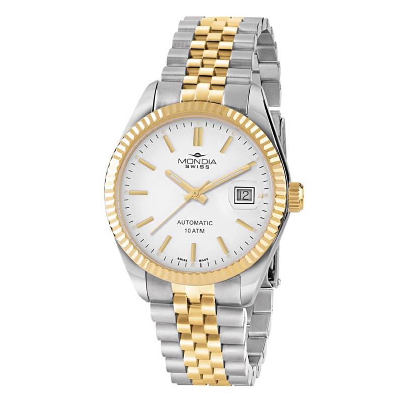 Créée en 1935, Mondia est une marque d'horlogerie suisse avec un passé significatif. Ses garde-temps sont prisés pour sa vocation à la précision, sa passion pour la mécanique pure et son attention portée au détail. À travers notre site, elle vous présente la montre Icon Legend Automatic MS-212-SO-42WT-GB dotée d'une élégance raffinée et des finitions sophistiquées. Celle-ci est proposée avec un beau boîtier bicolore, parfaitement rond, mesurant 40 mm de diamètre et 11 mm d'épaisseur. Celui-ci se compose d'une carrure conçue en acier inoxydable 316L argenté, rehaussé par un effet poli. Cette dernière est surmontée par une lunette cannelée plaquée en or jaune 750 reflétant une allure brillante. Elle est couronnée par un verre saphir plat traité antireflet qui offre une lisibilité optimale en plus de ses caractéristiques protectrices contre les rayures. À 3 heures, se place la couronne crantée et vissée, également dorée et qui assure le réglage des aiguilles et de la date pour un chronométrage précis. Pour ce qui est du fond de boîte, il est vissé et promet une étanchéité de 10 ATM.