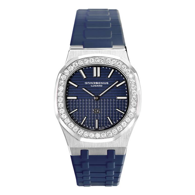 Le bracelet de cette montre est fait de silicone bleu, offrant à la fois confort et durabilité. Connu pour sa résistance aux éléments et sa souplesse, le silicone est le choix idéal pour celles qui désirent un accessoire à la fois pratique et élégant. Le fermoir déployant papillon argenté permet une ouverture et une fermeture fluides, sécurisant le maintien de la montre avec élégance. La largeur sur-mesure de l'entrecorne assure un ajustement parfait et personnalisé, renforçant l'impression de luxe et de sophistication que le bracelet diffuse.