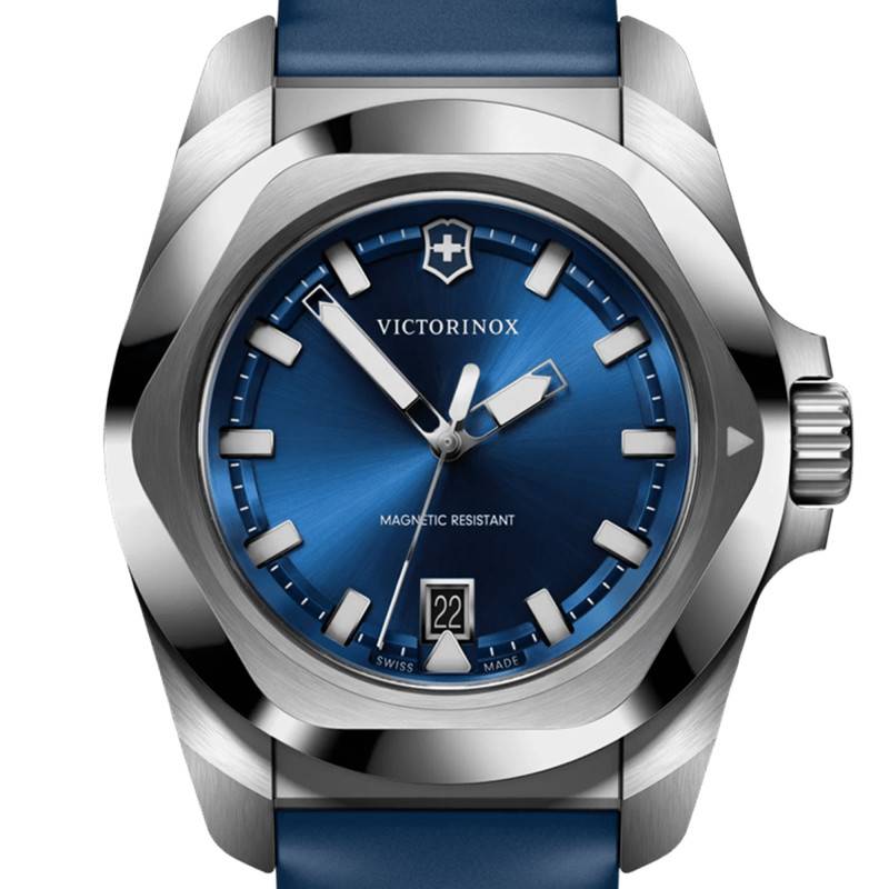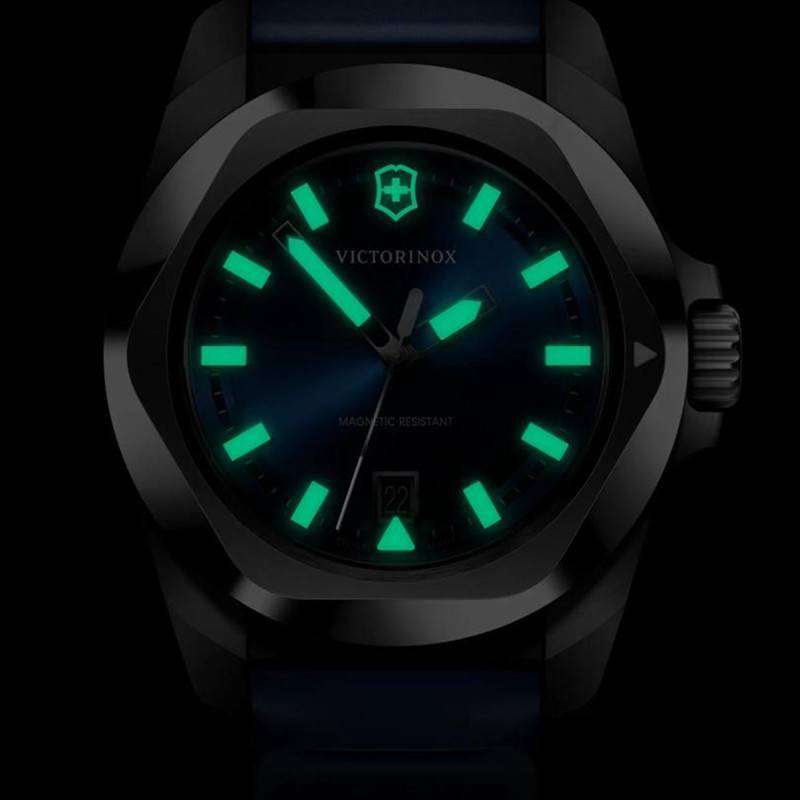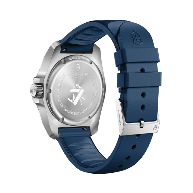Le cadran de la montre Victorinox I.N.O.X est une œuvre d'art en soi, habillé d'un somptueux bleu à finition soleillée. Les aiguilles et index luminescents assurent une lisibilité parfaite à toute heure du jour ou de la nuit, témoignant d'une attention aux détails et d'une fonctionnalité accrue. Un chemin de fer des minutes entoure le cadran, ajoutant précision et sophistication. À trois heures, un guichet date s'intègre avec discrétion, fournissant une information essentielle sans compromettre l'esthétique épurée.