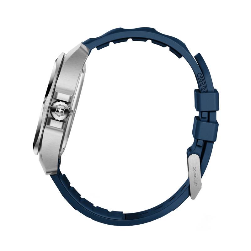 Le bracelet de la montre Victorinox I.N.O.X, réalisé en caoutchouc bleu, s'accorde harmonieusement avec le cadran, renforçant l'esthétique contemporaine et sportive de ce modèle. Connu pour sa durabilité et sa résistance aux conditions extrêmes, le caoutchouc offre un confort maximal sans sacrifier le style. Avec une largeur d'entrecorne de 21 mm, il assure un ajustement parfait et sécurisé autour du poignet. La fermeture à boucle ardillon offre une simplicité classique couplée à une sécurité fiable, idéale pour une utilisation quotidienne.