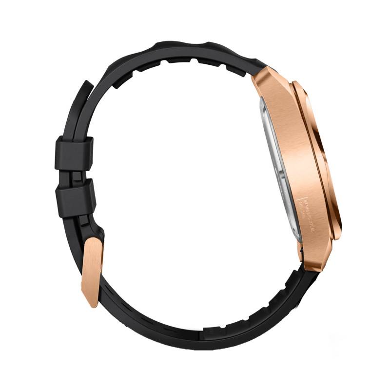La montre évoque une synergie parfaite entre style moderne et fonctionnalité robuste. Le boîtier rond de 41 mm en acier inoxydable 316L témoigne de sa durabilité exceptionnelle. Revêtue d'un élégant PVD rose, elle s'affiche avec une double finition mate brossée et brillante polie, qui accentue son charme urbanisé tout en préservant une note de sophistication intemporelle. D'un poids de 108 grammes, elle assure une présence affirmée au poignet sans compromettre le confort. Son fond de boîte est vissé, garantissant une étanchéité accrue et une protection optimale contre les agressions extérieures. La couronne vissée renforce cette capacité, essentielle pour ceux qui mènent un style de vie actif.