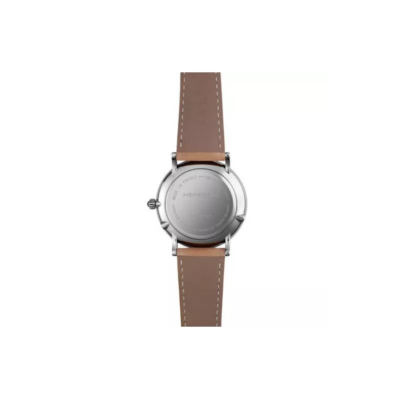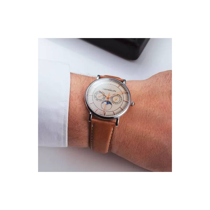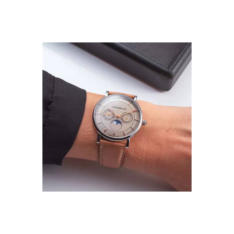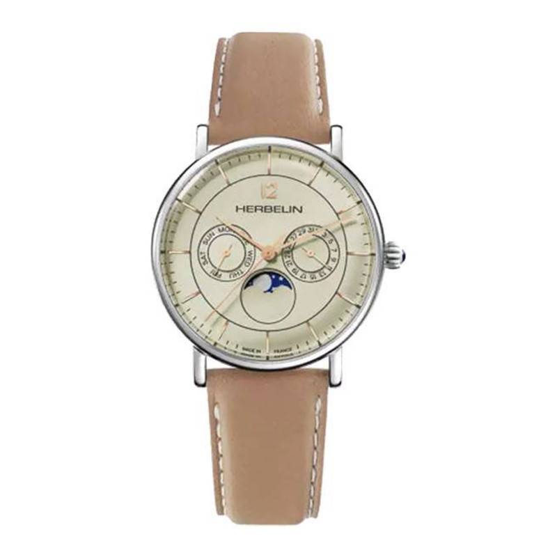 Le cadran rond et de couleur beige comporte trois magnifiques compteurs. Le premier situé à 9 heures permet de déterminer le jour de la semaine, le deuxième situé à 3 heures donne la date du jour, et le dernier situé à 6 heures est un compteur à phase de lune. Trois aiguilles viennent compléter le cadran pour renseigner les heures, les minutes et les secondes. Des index en bâtons, de même couleur que les aiguilles, viennent se dessiner entre le chemin de fer des minutes. Michel Herbelin signe sa création à 12 heures.