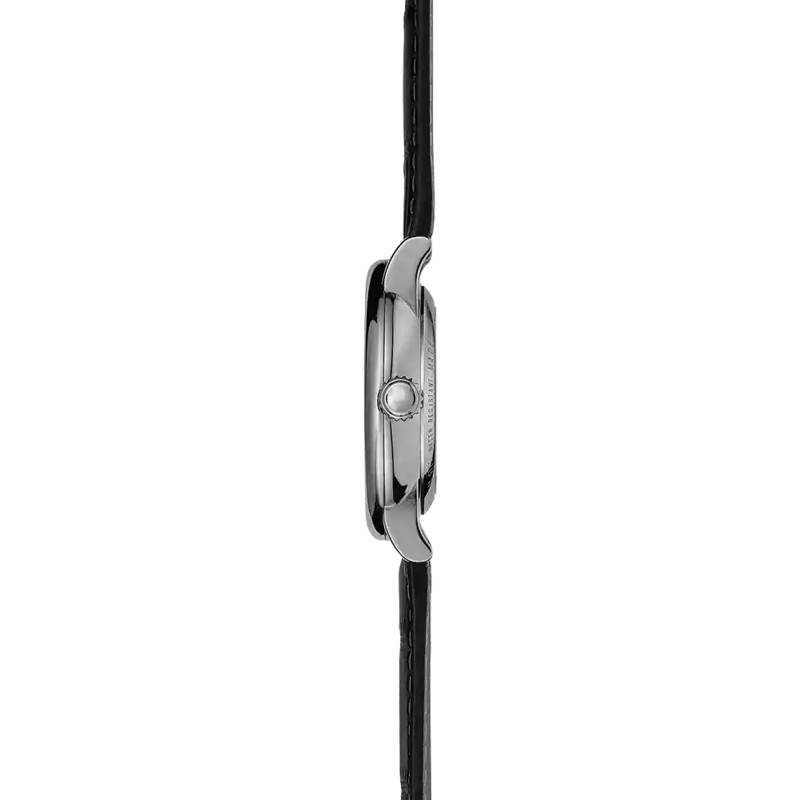Le bracelet, en cuir de bovin noir avec un motif alligator distinctif, confère à cette montre une allure classique et intemporelle. La texture riche de ce cuir, associée aux surpiqûres délicates, crée un contraste visuel étonnant. Il est conçu pour un confort optimal, épousant naturellement la courbe du poignet grâce à sa souplesse. Le bracelet se ferme avec une boucle ardillon, assurant à la fois sécurité et élégance lors de son port.
