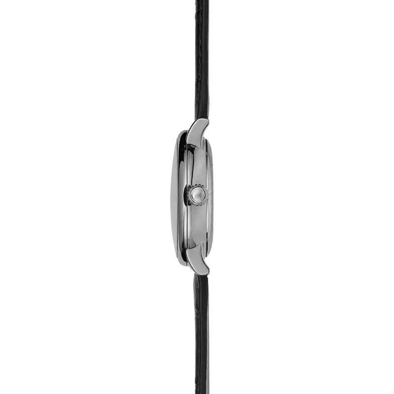 Le bracelet en cuir de bovin complète admirablement cette montre, apportant un confort inégalé et une élégance discrète. Sa couleur marron et son motif alligator ajoutent une touche sophistiquée, accentuée par des surpiqûres méticuleusement placées. La largeur standard du bracelet assure un fitting parfait au boîtier, tandis que la boucle ardillon assure une sécurisation fiable au poignet.