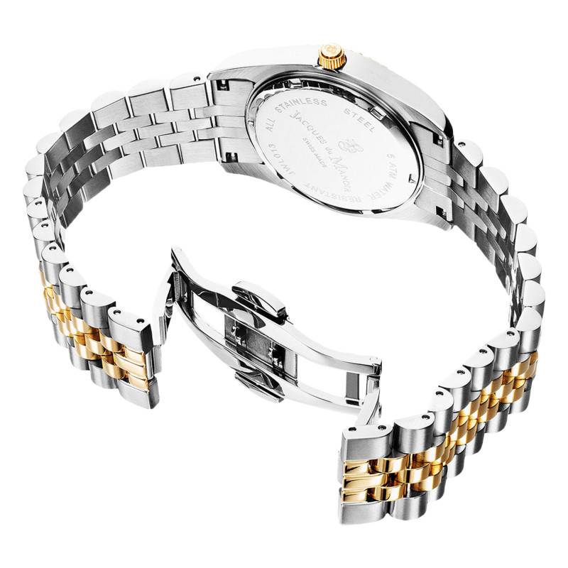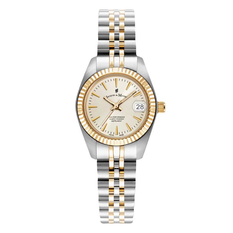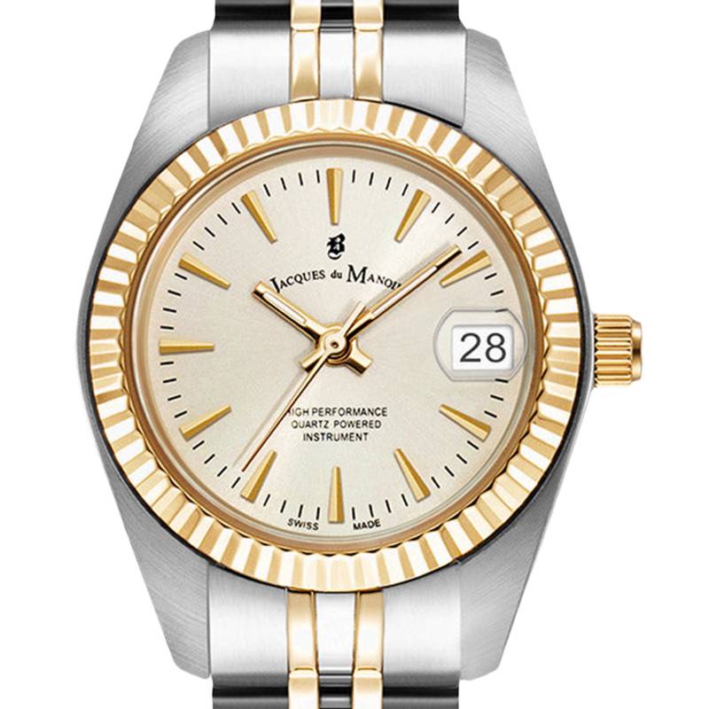 Jacques Du Manoir est une marque horlogère qui se distingue par la diversité de ses garde-temps. Ses modèles combinent élégance, performance et fonctionnalité pour le bonheur des passionnés. Ils s'imposent par la finesse de leurs courbes et la délicatesse de leurs silhouettes. Vous allez adorer cette magnifique montre Inspiration Classique JWL02102 pensée pour toutes les dames à la recherche d'authenticité. Elle arbore un boîtier rond de 26 mm de diamètre réalisé en acier inoxydable gris de finition brossée et polie et intègre une lunette dorée de style cannelé qui ajoute une touche distinctive à l'ensemble. Le cadran est recouvert d'un verre minéral tandis que la couronne dorée et crantée à 3 heures permet le réglage des indicateurs centraux. Pour finir, cette montre est étanche à 5 ATM grâce à son fond emboîté.