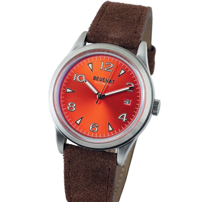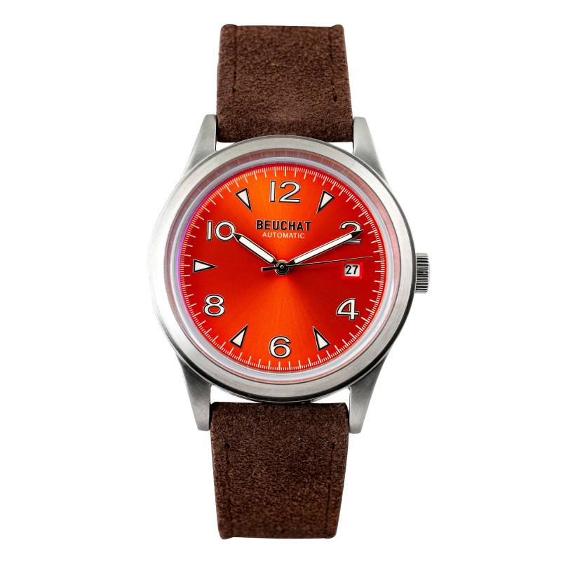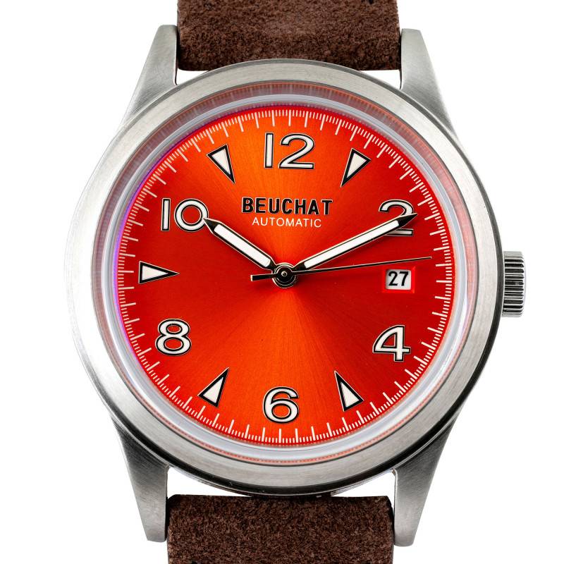 Le cadran de la montre, résolument moderne et éclatant, arbore une couleur orange vive qui captivera à coup sûr tous les regards. Doté de chiffres arabes et d'index minutieusement placés, le cadran facilite une lecture rapide et efficace de l'heure. Les aiguilles, élégamment luminescentes, garantissent également la lisibilité même dans l'obscurité, apportant ainsi une fonctionnalité indispensable pour les noctambules. La présence du verre minéral à traitement saphir sur le cadran bombé offre une protection remarquable contre les rayures, améliorant par là même sa durabilité et son esthétique. Ce cadran n'oublie pas de se parer d'un guichet pour la date, subtilement positionné à 3 heures, un détail discret mais particulièrement utile au quotidien pour ne jamais perdre la notion du temps.