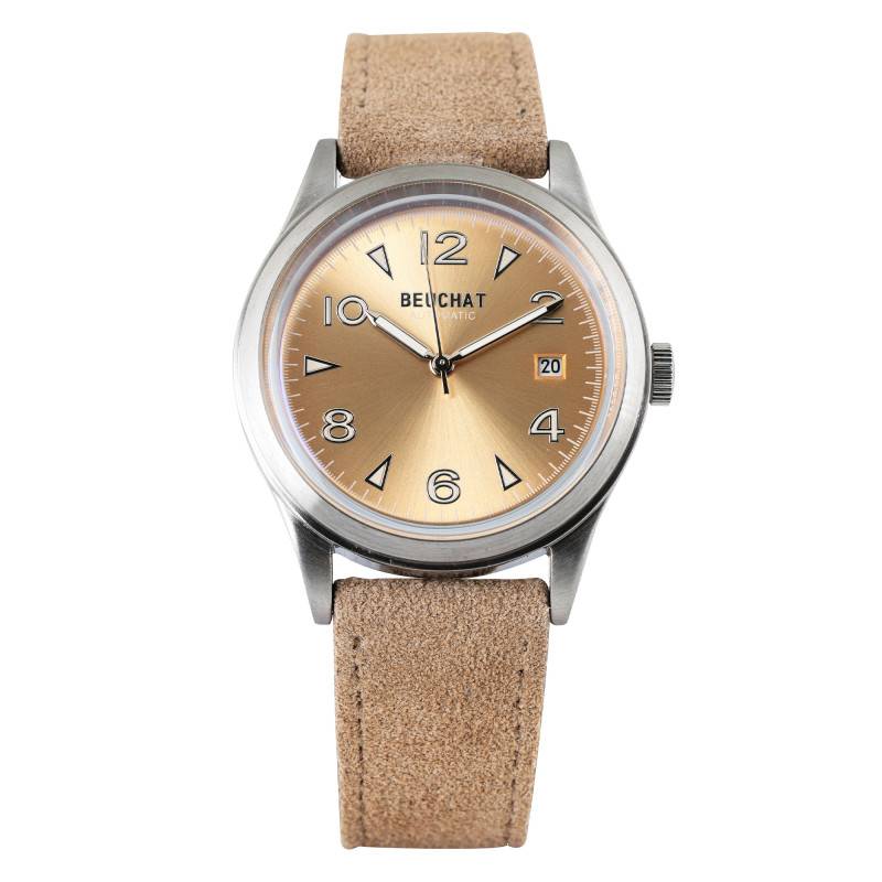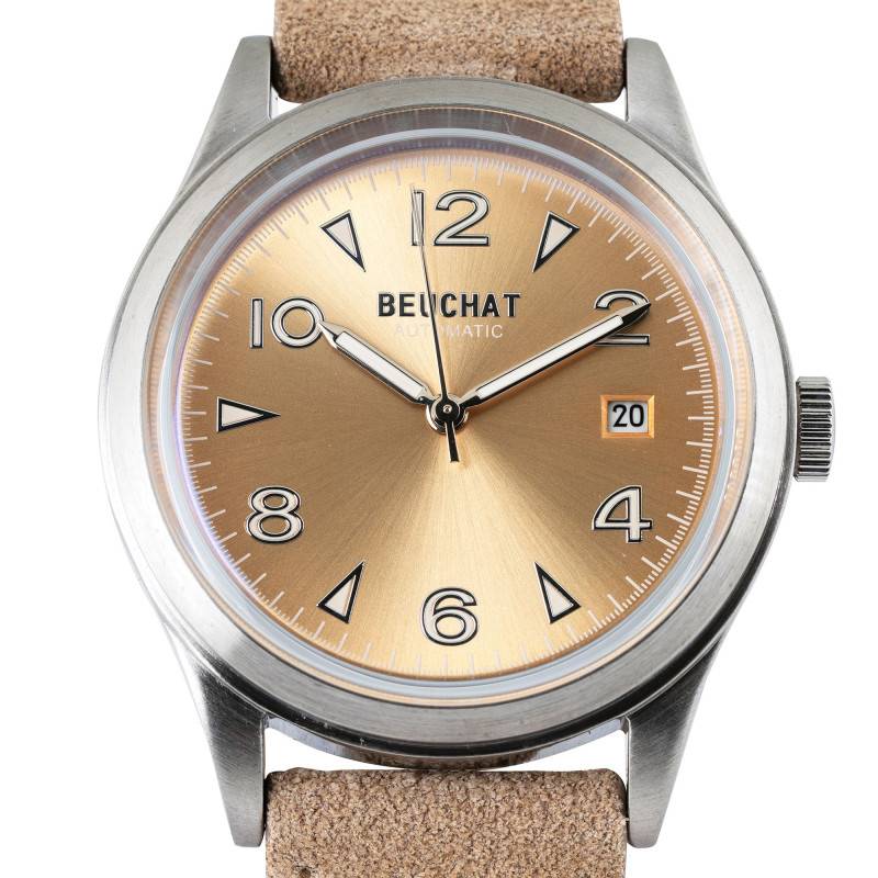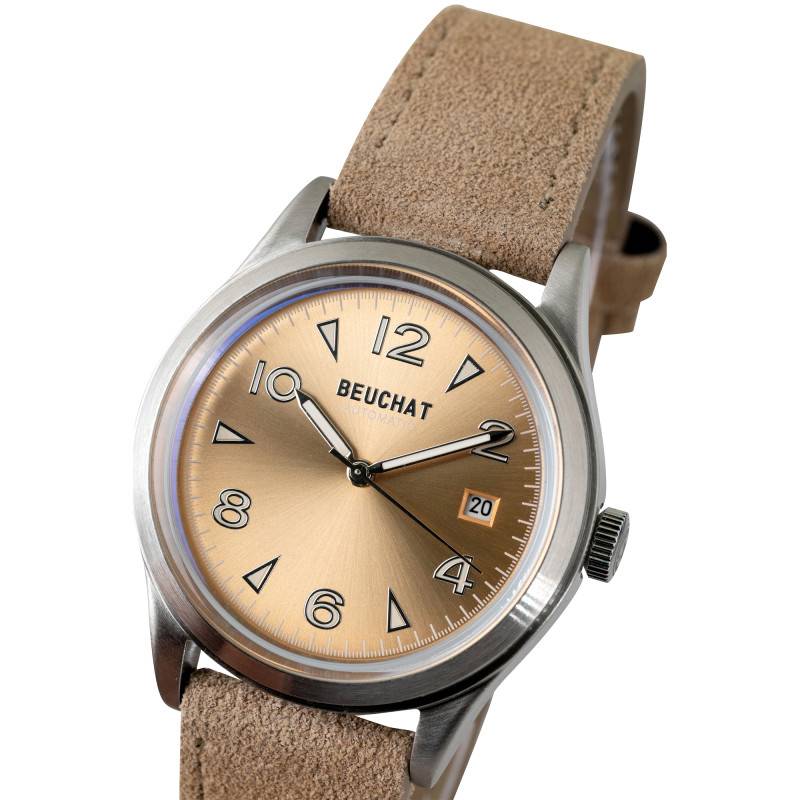 Cette montre, créée par Beuchat, arbore un design à la fois moderne et intemporel, parfait pour convenir à tous les styles et occasions. Le boîtier en acier inoxydable de 39 mm, associé à une épaisseur optimisée de 11 mm, offre une durabilité remarquable et un esthétisme épuré. Sa forme ronde classique reflète un savoir-faire horloger parfaitement maîtrisé. Dotée d'une lunette fixe, cette montre reste sobre tout en affirmant une certaine élégance. Le fond de la boîte est vissé, garantissant une protection accrue contre les éléments extérieurs, et le verre bombé en minéral traité au saphir ajoute une résistance exceptionnelle aux rayures, tout en préservant la transparence et la lisibilité du cadran. Un bouton remontoir unique sur le côté du boîtier permet les réglages nécessaires avec facilité.