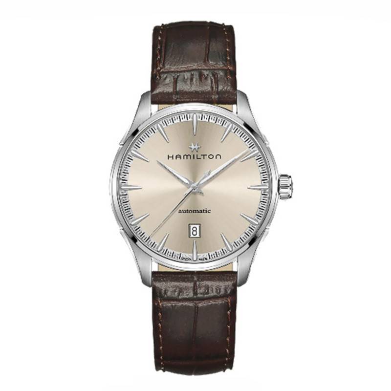 Laissez-vous séduire par ce splendide garde-temps équipé d'un élégant cadran beige de forme ronde. Ce modèle Jazzmaster est un classique incontournable de l'horlogerie suisse. Vous retrouverez une finition soleillée qui mettra en lumière à chacun de vos mouvements la lecture des heures et des minutes accessible grâce aux deux aiguilles dauphines argentées. Cette lecture est complétée par les index des heures dévoilées sur le pourtour du cadran. Les indicateurs présentés possèdent un revêtement luminescent qui vous donnera accès aux heures et aux minutes en milieu sombre. Un chemin de fer des minutes est identifiable sur le cercle extérieur et vous offrira une précision incontestable au quotidien. Les secondes sont quant à elles définies par une trotteuse qui parcourt avec finesse le cadran. N'oubliez aucun de vos rendez-vous grâce au guichet situé à 6 heures qui vous rappelle la date au quotidien. Au-dessus de cet élément temporel est indiquée la nature du mécanisme qui anime le garde-temps par la mention "automatic". Enfin, cette sublime pièce horlogère est signée par Hamilton sous l'index des douze heures.