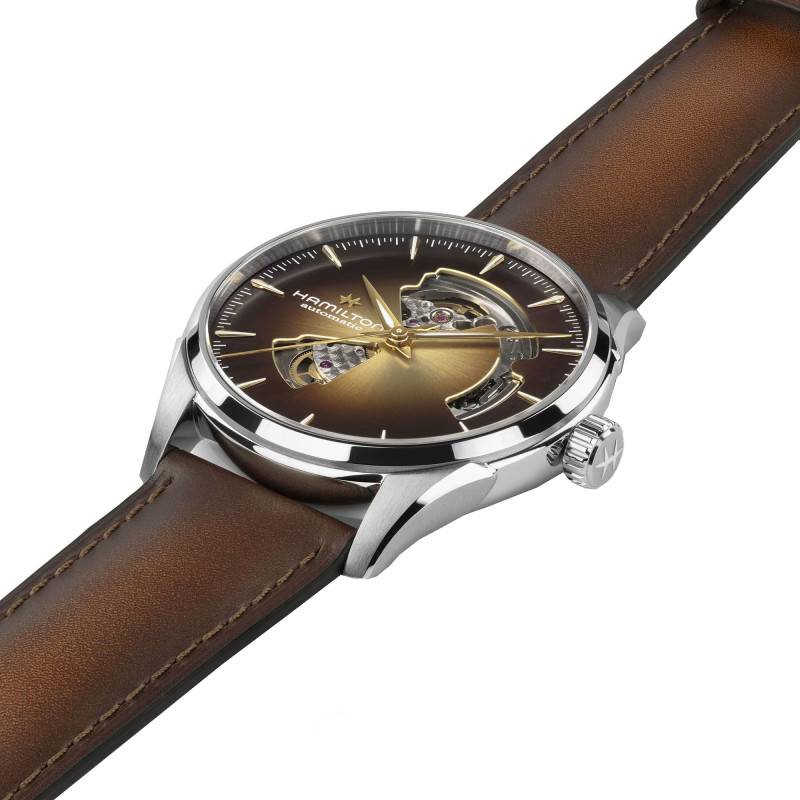 La montre Hamilton Jazzmaster Open Heart Auto 42 mm se distingue par son boîtier rond en acier inoxydable et sa finition combinant des effets satinés et polis qui lui accordent une allure à la fois classique et sophistiquée. Le verre saphir plat avec traitement anti-reflets offre une clarté exceptionnelle tout en résistant efficacement aux rayures. Le boîtier, mesurant 42 mm de diamètre et 11,45 mm d'épaisseur, est conçu pour une fabrication suisse garante d'une qualité irréprochable.