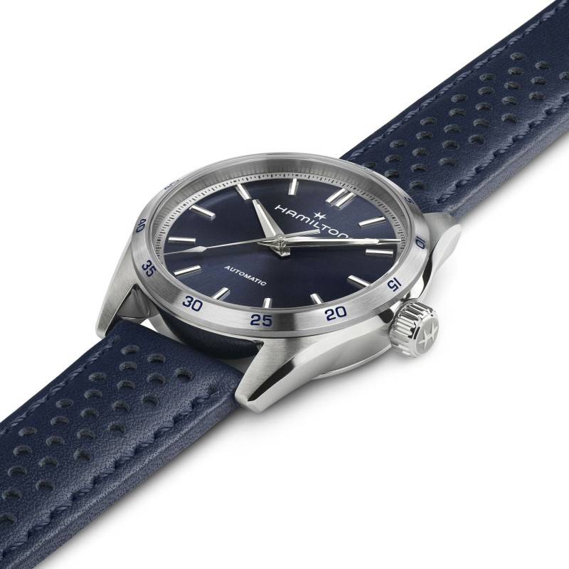 Hamilton est une manufacture horlogère fondée en 1892 à Lancaster. Depuis ses débuts, la marque n'a eu de cesse de repousser les limites en matière d'innovation grâce à son indéfectible savoir-faire et sa précision hors norme. On lui reconnaît la première montre électrique au monde en 1957 et la première montre digitale à LED en 1970. Ses collections célèbrent à la perfection ses valeurs et témoignent de son expertise. En démontre la collection Jazzmaster qui renferme des modèles au design racé réalisés avec des matériaux de très belle facture tel que cette Performer Auto H36115640. D'un style contemporain et moderne, il conjugue esprit américain et précision suisse et dévoile un boîtier rond de couleur grise en acier inoxydable. Avec 34 mm de diamètre et 11,16 mm d'épaisseur, il est destiné aux femmes qui ont le sens de l'esthétique. Sa lunette graduée de couleur argentée entoure un verre saphir antireflet qui recouvre et protège le cadran des chocs et des rayures quotidiens. Vous compterez sur sa couronne argentée, crantée et vissée à 3 heures pour le réglage des aiguilles centrales. Enfin, son fond de boite vissé et transparent laisse admirer le mécanisme et assure une étanchéité de 10 ATM.
