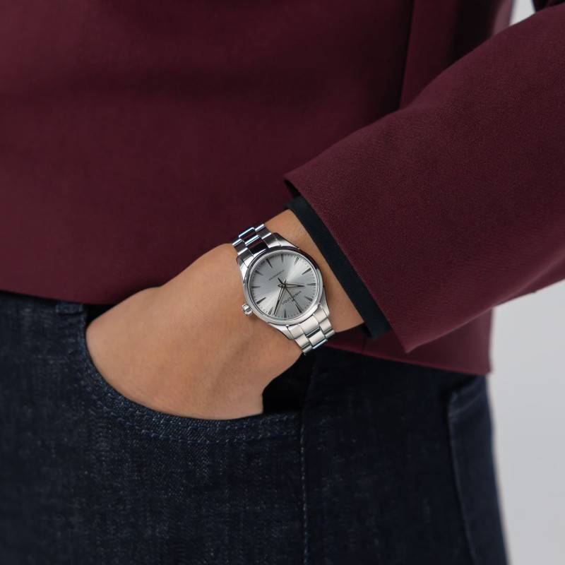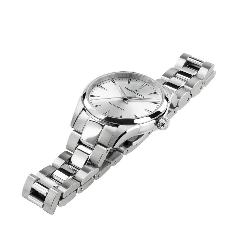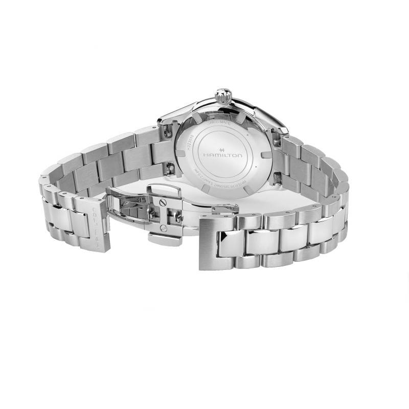 La montre Hamilton Jazzmaster incarne l'essence même du raffinement à travers ses lignes épurées et son design soigné. Confectionnée avec précision en Suisse, cette montre dispose d'un boîtier rond au diamètre de 32 mm et d'une épaisseur de 7,80 mm, assurant un confort optimal au poignet. Le boîtier en acier inoxydable offre une double finition à la fois mate et polie, ce qui souligne son allure moderne tout en restant intemporelle. La montre est conçue pour résister aux épreuves du temps grâce à son fond de boîte vissé, garantissant une étanchéité jusqu'à 5 ATM, ce qui la rend adaptée aux activités quotidiennes, et même à des éclaboussures occasionnelles.
