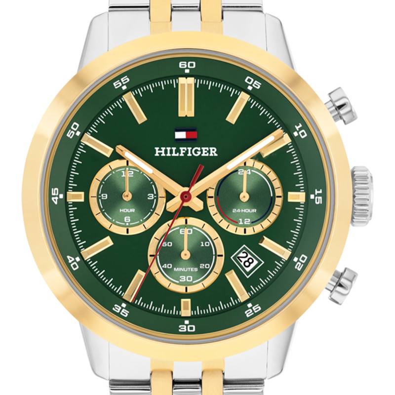 Le cadran est la pièce maîtresse de cette montre, attirant l'œil par sa couleur verte vibrante et sa finition soleillée. Les indices en chiffres arabes et le chemin de fer pour les minutes garantissent une lecture fluide de l'heure. Les trois compteurs additionnels positionnés harmonieusement sur le cadran offrent des fonctions chronographe de 12 h, 24 h et 60 minutes, le tout sous l'éclairage subtil d'aiguilles luminescentes pour une lisibilité accrue même dans l'obscurité. Un guichet intégré indique le jour, complétant ainsi les fonctionnalités pratiques et esthétiques du cadran.
